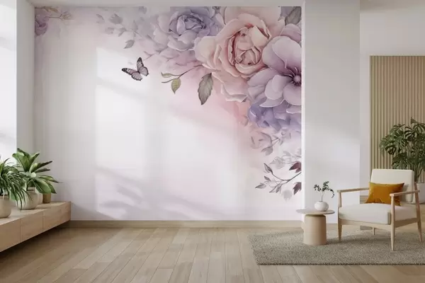 Fototapet Delikata rosa och lila blommor med en fjäril Nr. w04711
