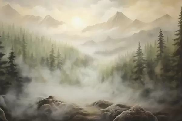 Fototapet Skog i dimman mot bakgrund av berg Nr. w04730
