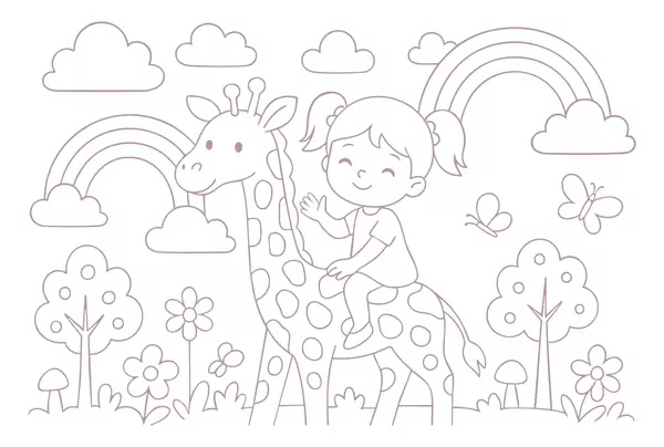 Fototapet svartvit teckning av en flicka på en giraff i stil med en målarbok för barn Nr. w04753