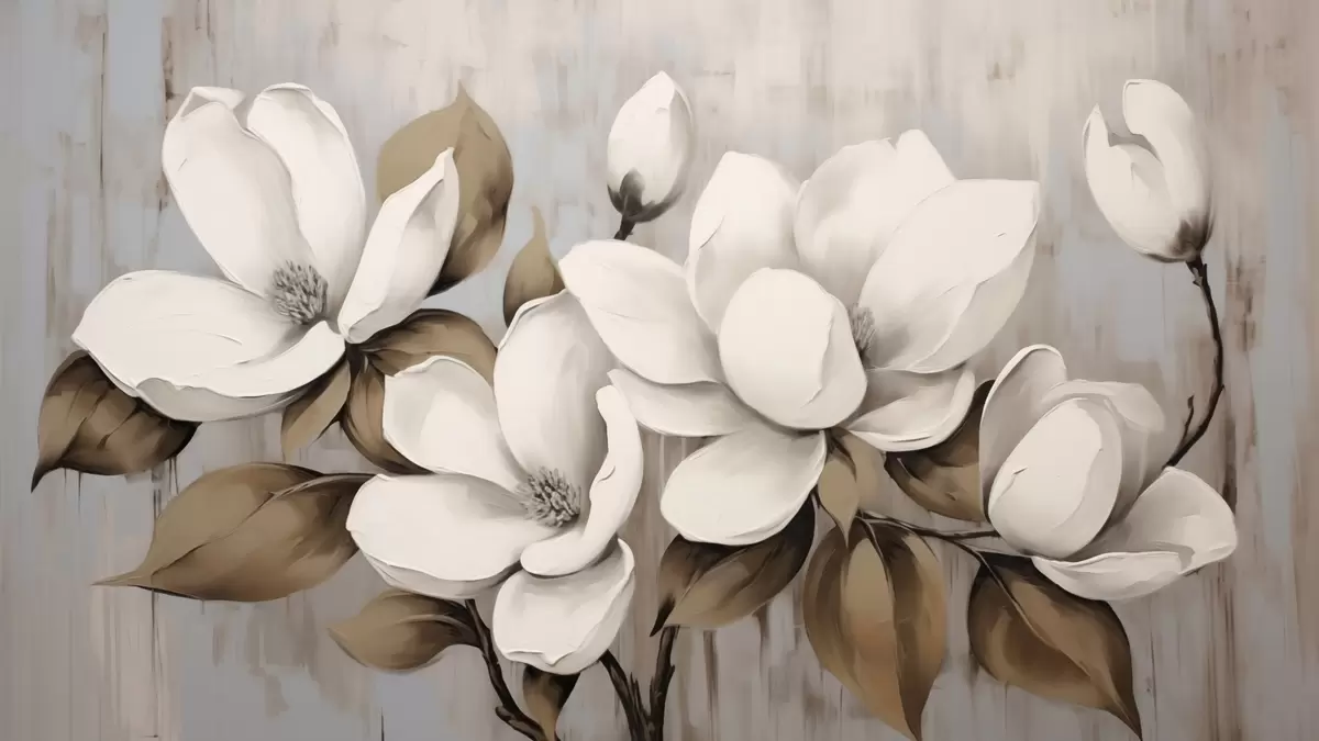 Fototapet Stora magnoliablommor med taupefärgade blad på borstad bakgrund Nr. w04785