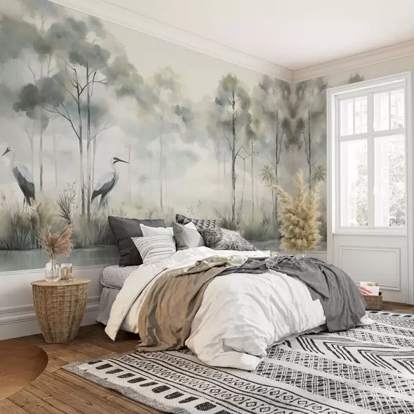 Fototapet Dimma i skogen vid vattnet med hägrar, mjuk och sval färgskala Nr. w04788