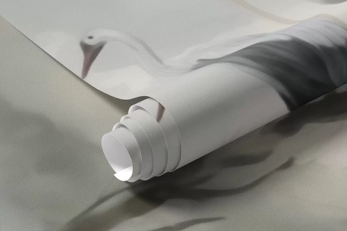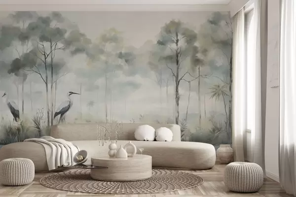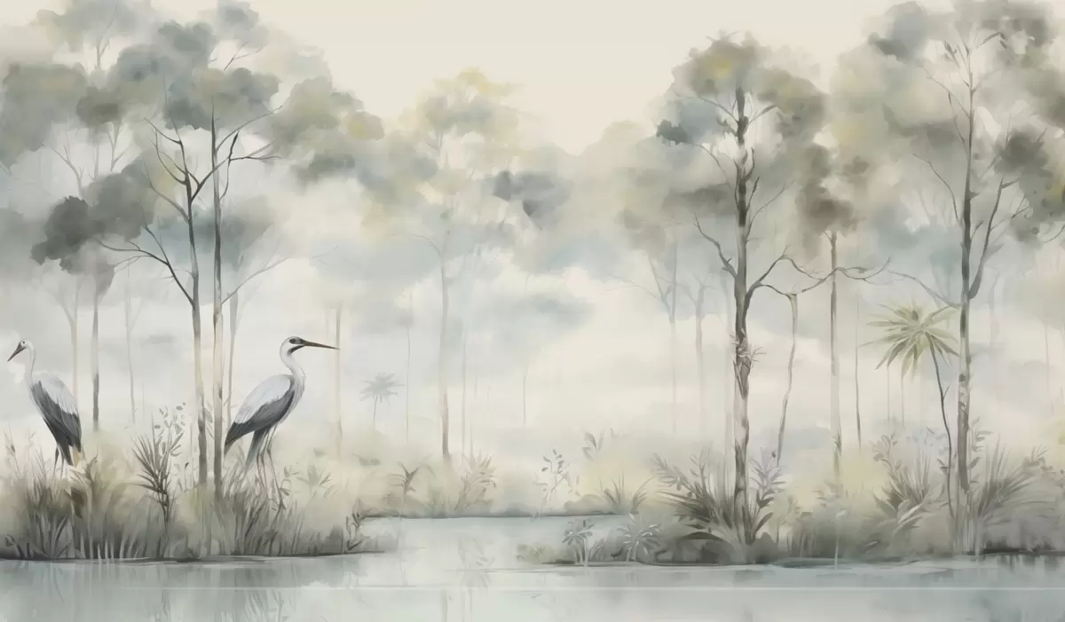 Fototapet Dimma i skogen vid vattnet med hägrar, mjuk och sval färgskala Nr. w04788