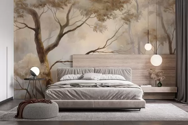 Fototapet Skogen i den lätta morgondimman. En delikat stämningsfull målning i stil med ett konstnärligt landskap. Nr. w04817