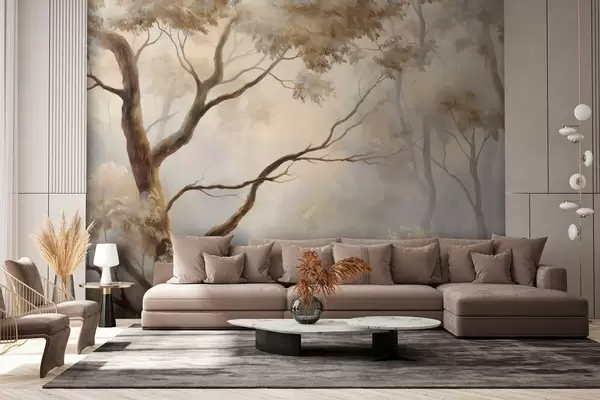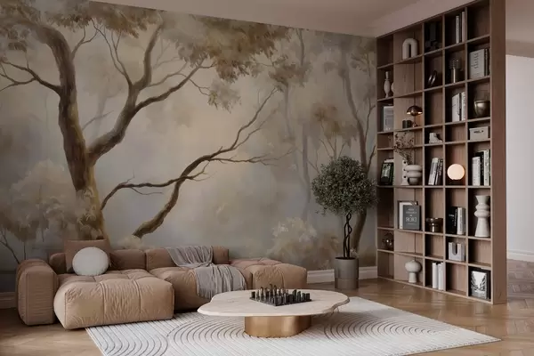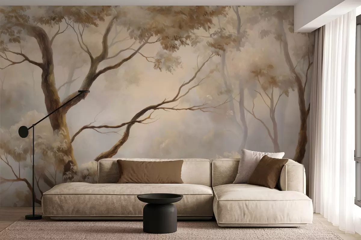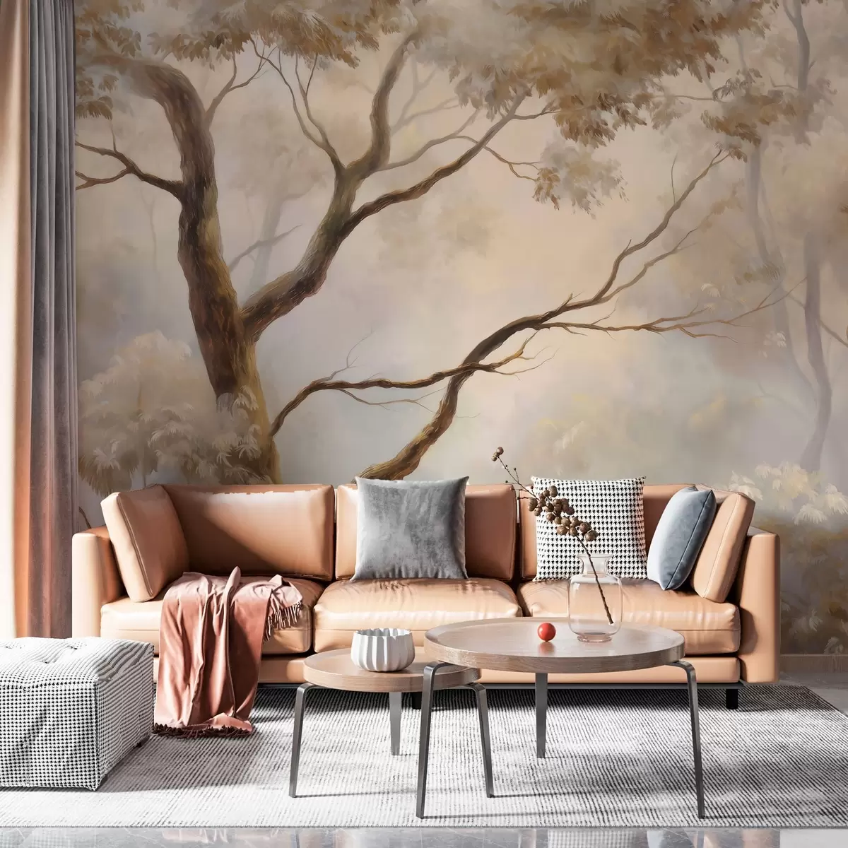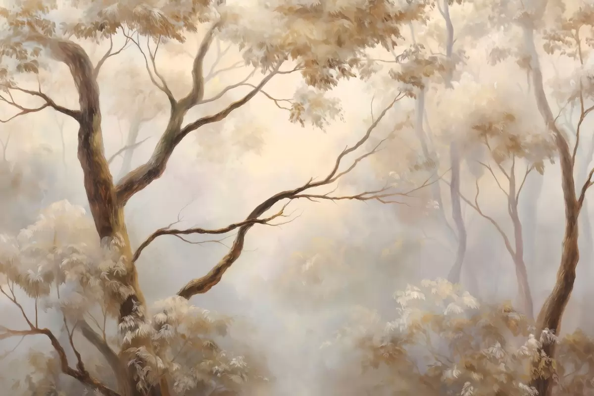 Fototapet Skogen i den lätta morgondimman. En delikat stämningsfull målning i stil med ett konstnärligt landskap. Nr. w04817