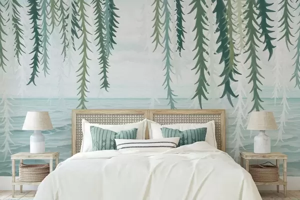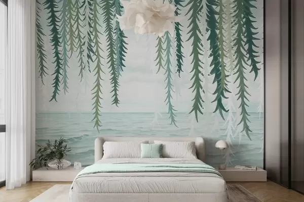 Fototapet Delikata vinstockar som hänger över vatten i akvarellstil w04830