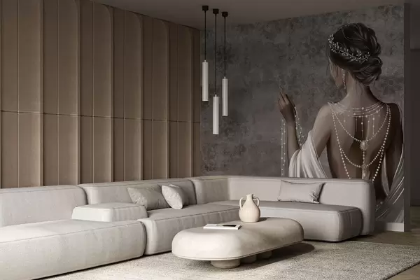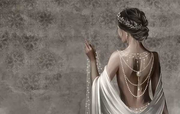 Fototapet Kvinna sedd bakifrån med pärlor, grå stenmönstrad bakgrund Nr. w04854
