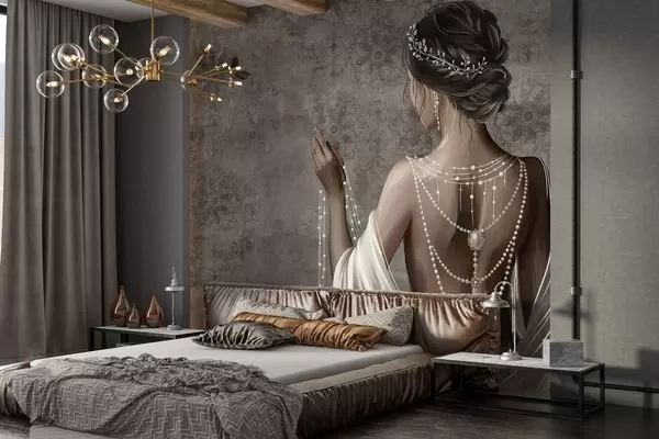 Fototapet Kvinna sedd bakifrån med pärlor, grå stenmönstrad bakgrund Nr. w04854