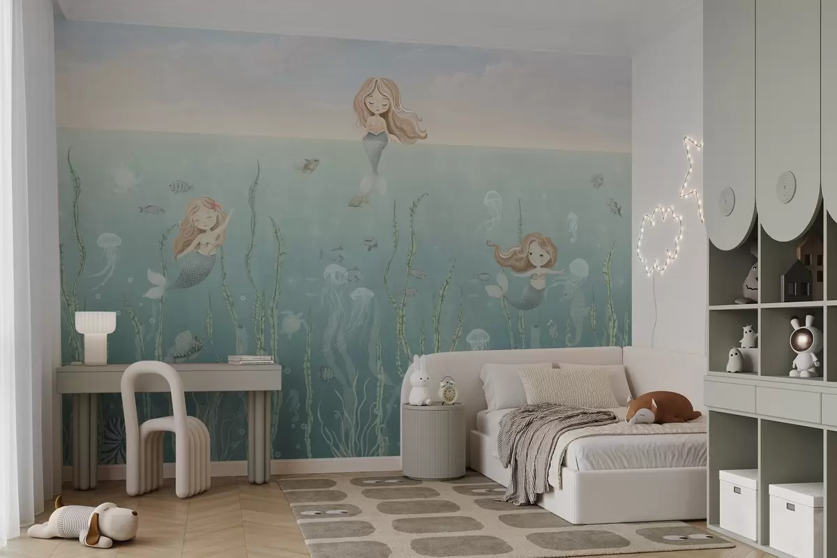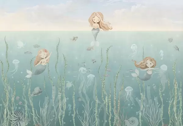 Fototapet Lekfulla sjöjungfrur under havet med tång, maneter och fiskar Nr. w04860