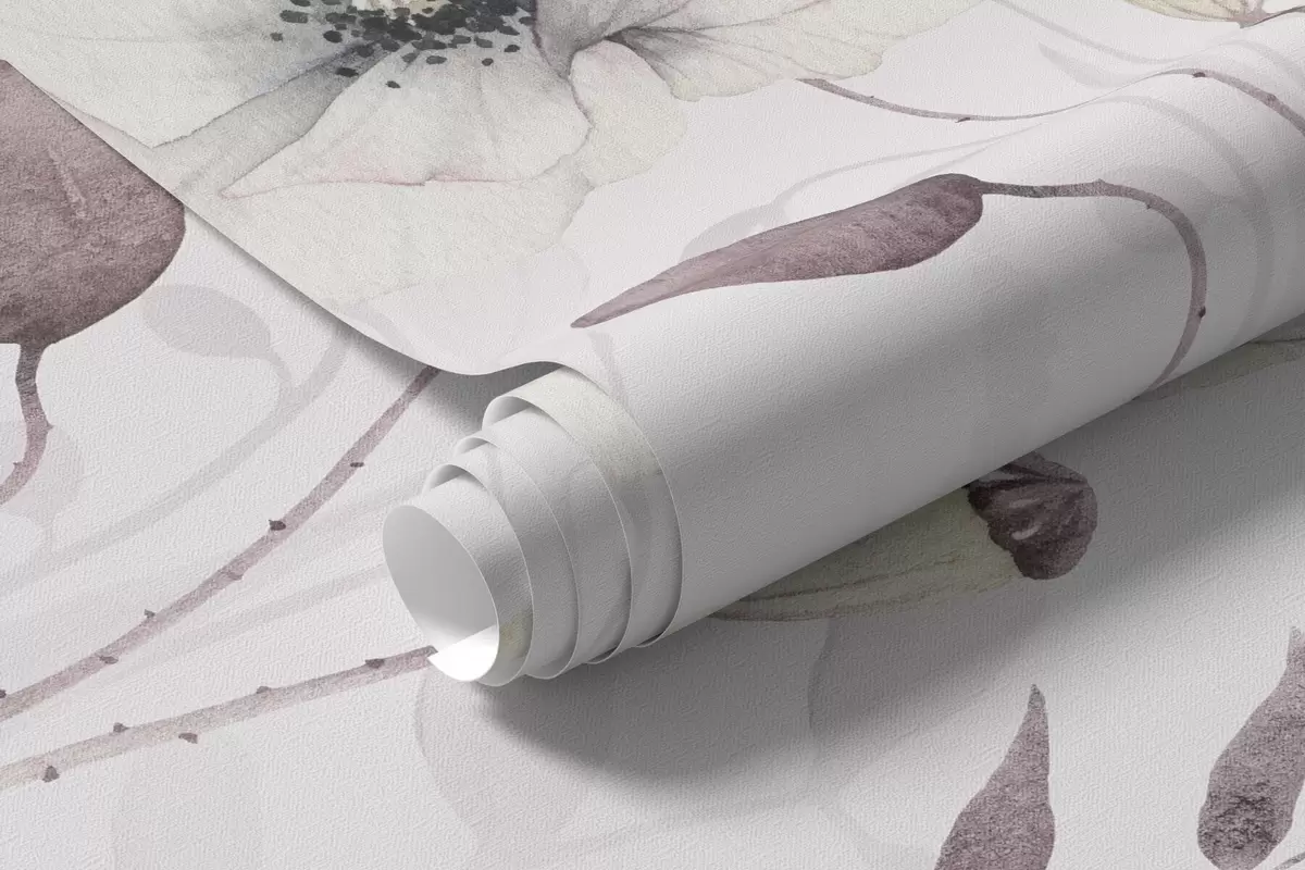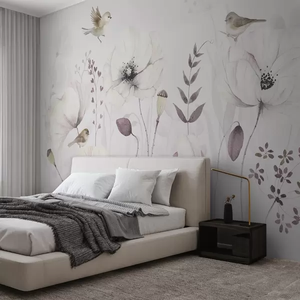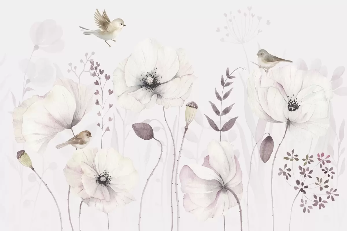 Fototapet Akvarellmålade vallmor med små fåglar i mjukt lila Nr. w04861