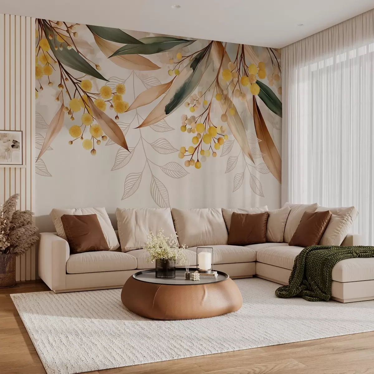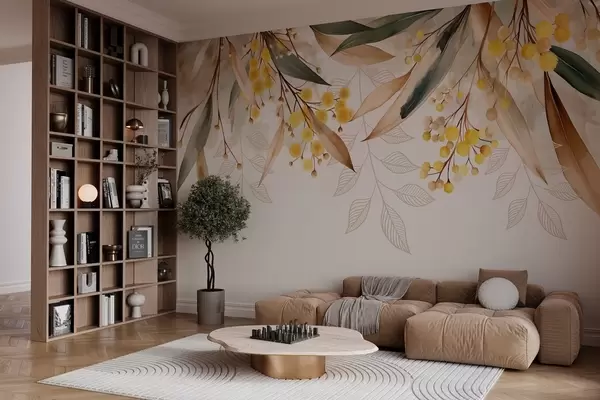 Fototapet blommor och blad av mimosa som faller från ovan i akvarellstil Nr. w04880