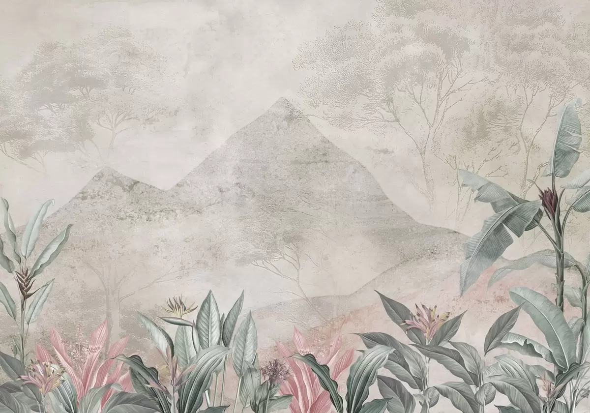 Fototapet Pastellfärgade bananblad och tropiska blommor mot bergen Nr. w04933