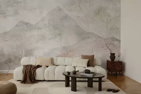 Fototapet Mjuka pastellfärgade berg och träd i lätt dimma Nr. w04954