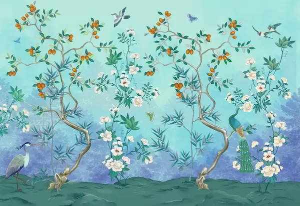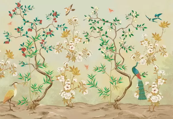 Fototapet Dekorativ scen med träd, blommor och fåglar på mörk bakgrund Nr. w05004