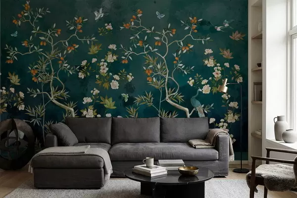 Fototapet Dekorativ scen med träd, blommor och fåglar på mörk bakgrund Nr. w05004