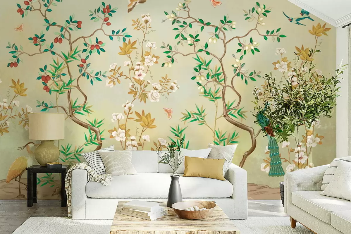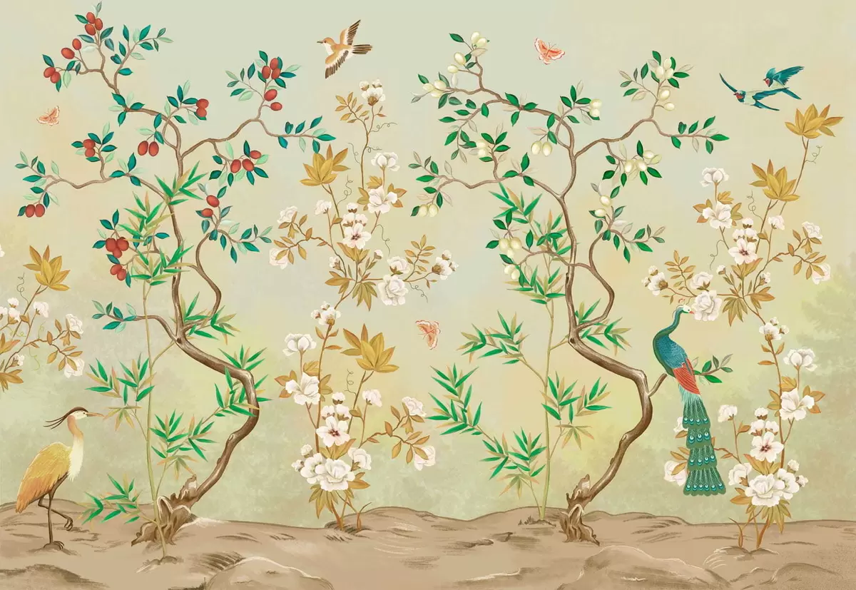 Fototapet Scene med träd, blommor och fåglar, ljus bakgrund Nr. w05004v1