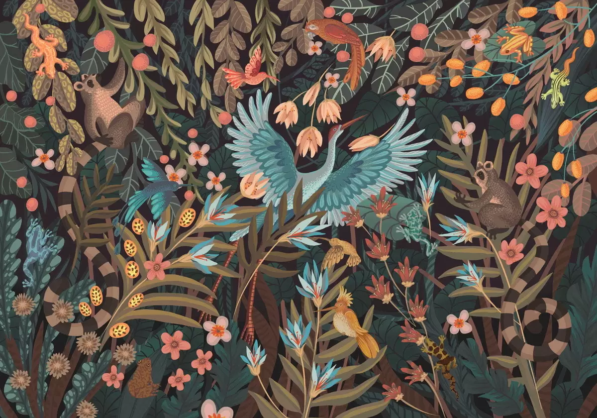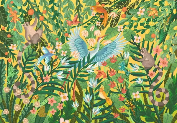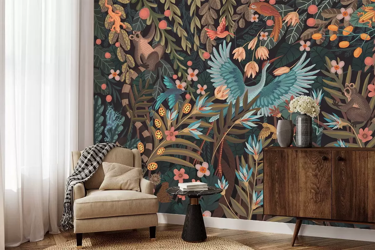 Fototapet Fantasi-scen med fåglar och djur bland växter Nr. w05024