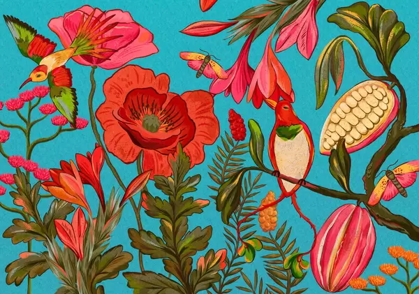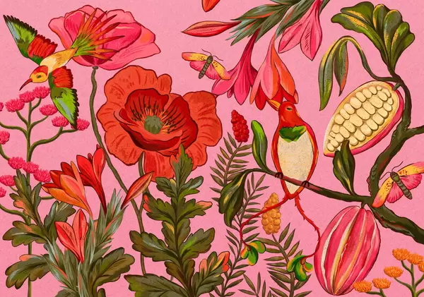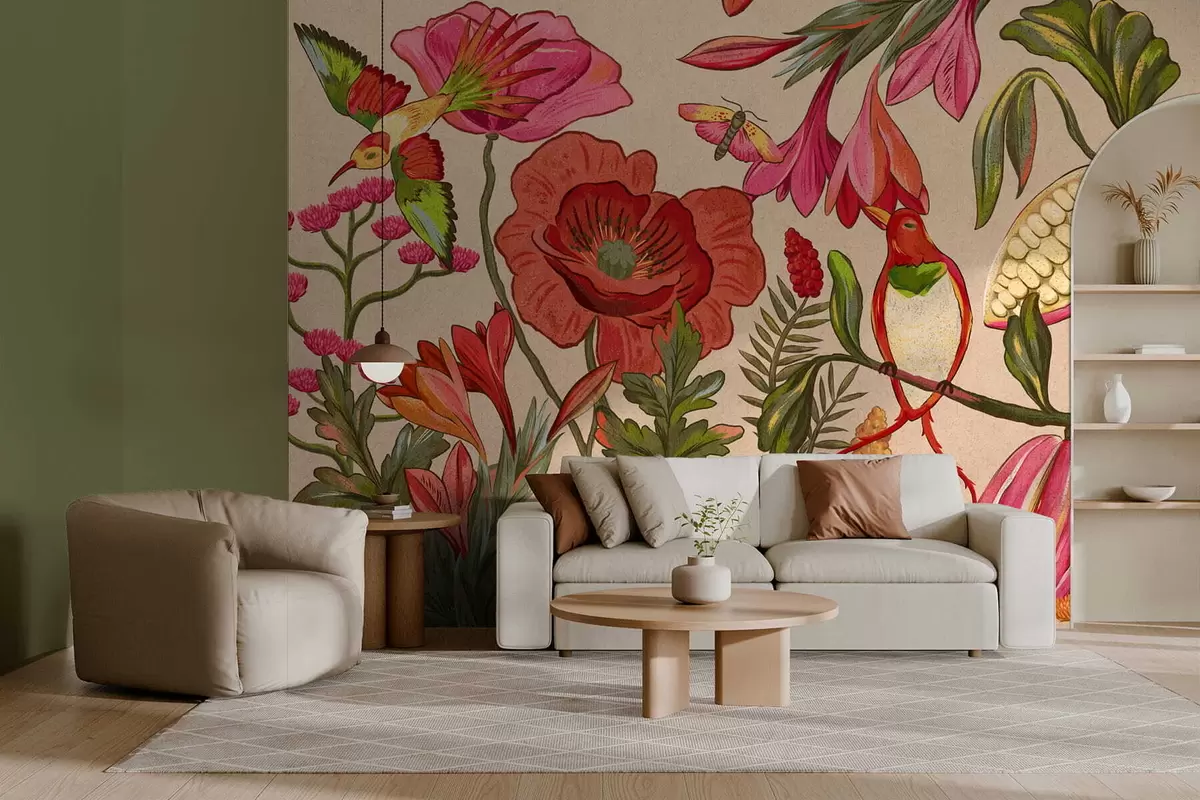 Fototapet Dekorativa blommor och fåglar på beige bakgrund Nr. w05036
