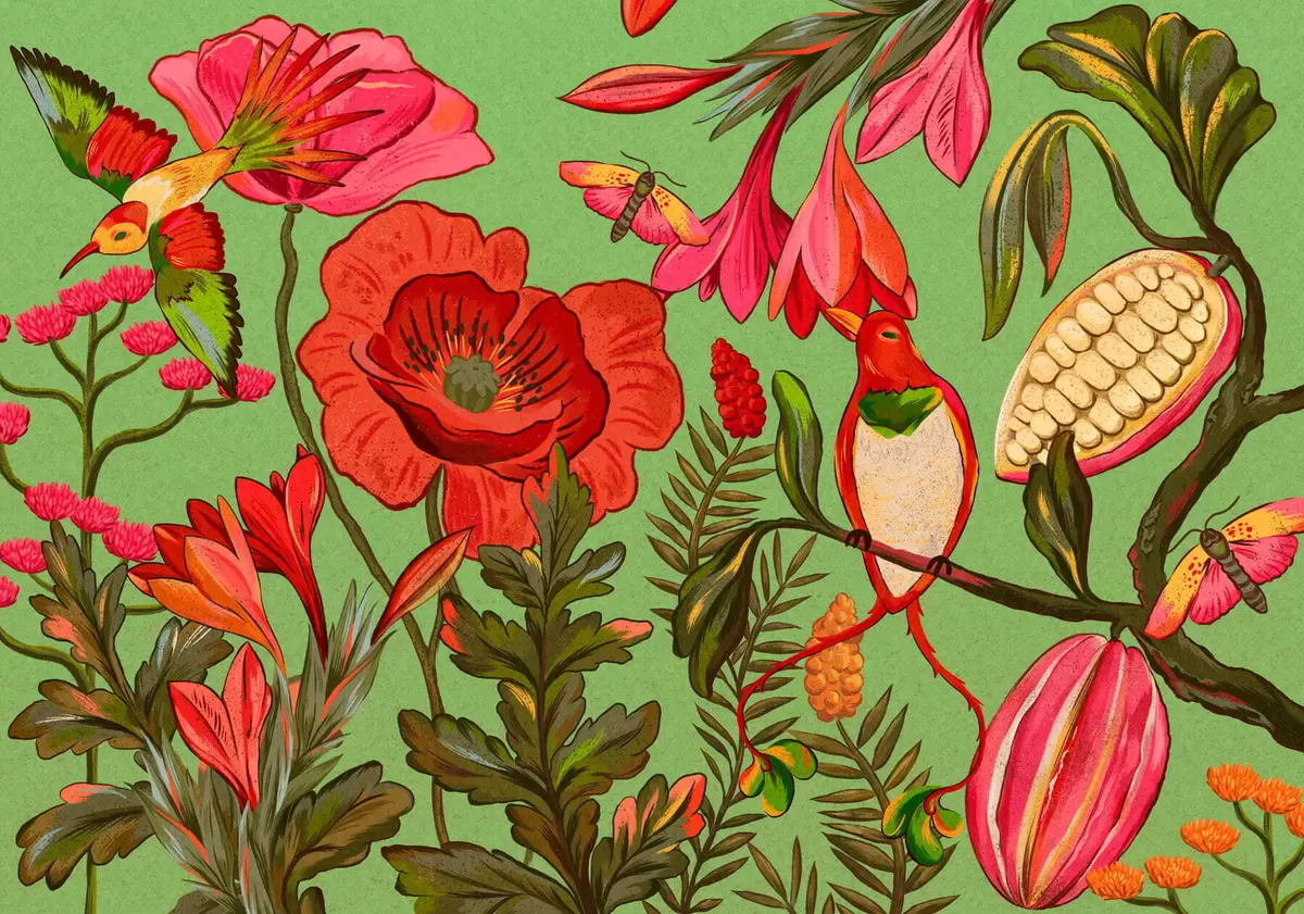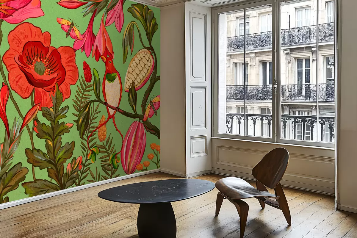 Fototapet Dekorativa blommor och fåglar på grön bakgrund Nr. w05036v1
