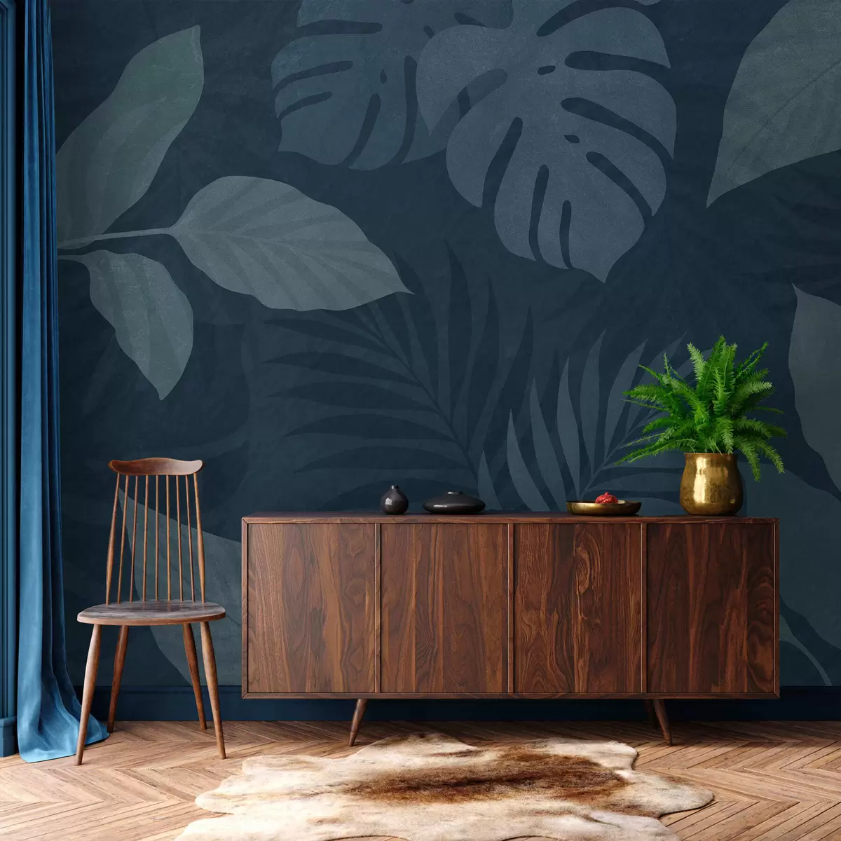 Fototapet strukturerade tropiska blad på mörkblå bakgrund Nr. w05063v3