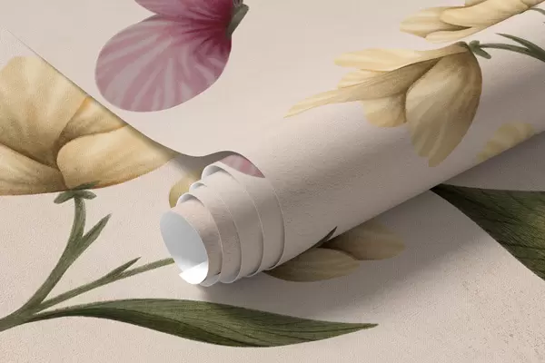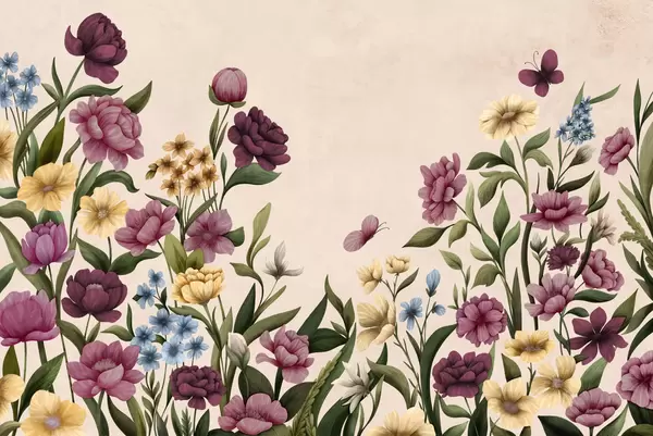 Fototapet Blomsterkomposition med växter och fjärilar på ljus bakgrund Nr. w05072