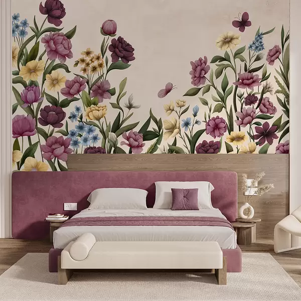 Fototapet Blomsterkomposition med växter och fjärilar på ljus bakgrund Nr. w05072
