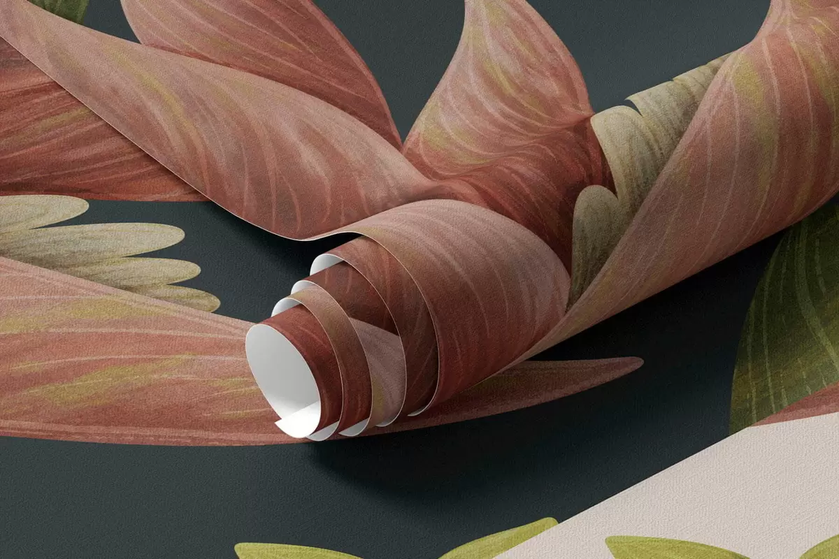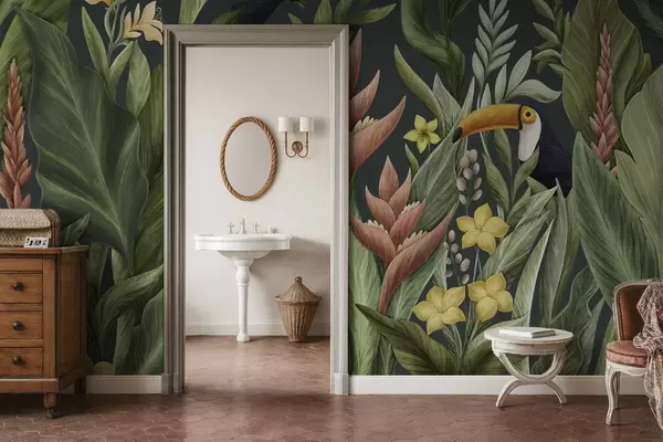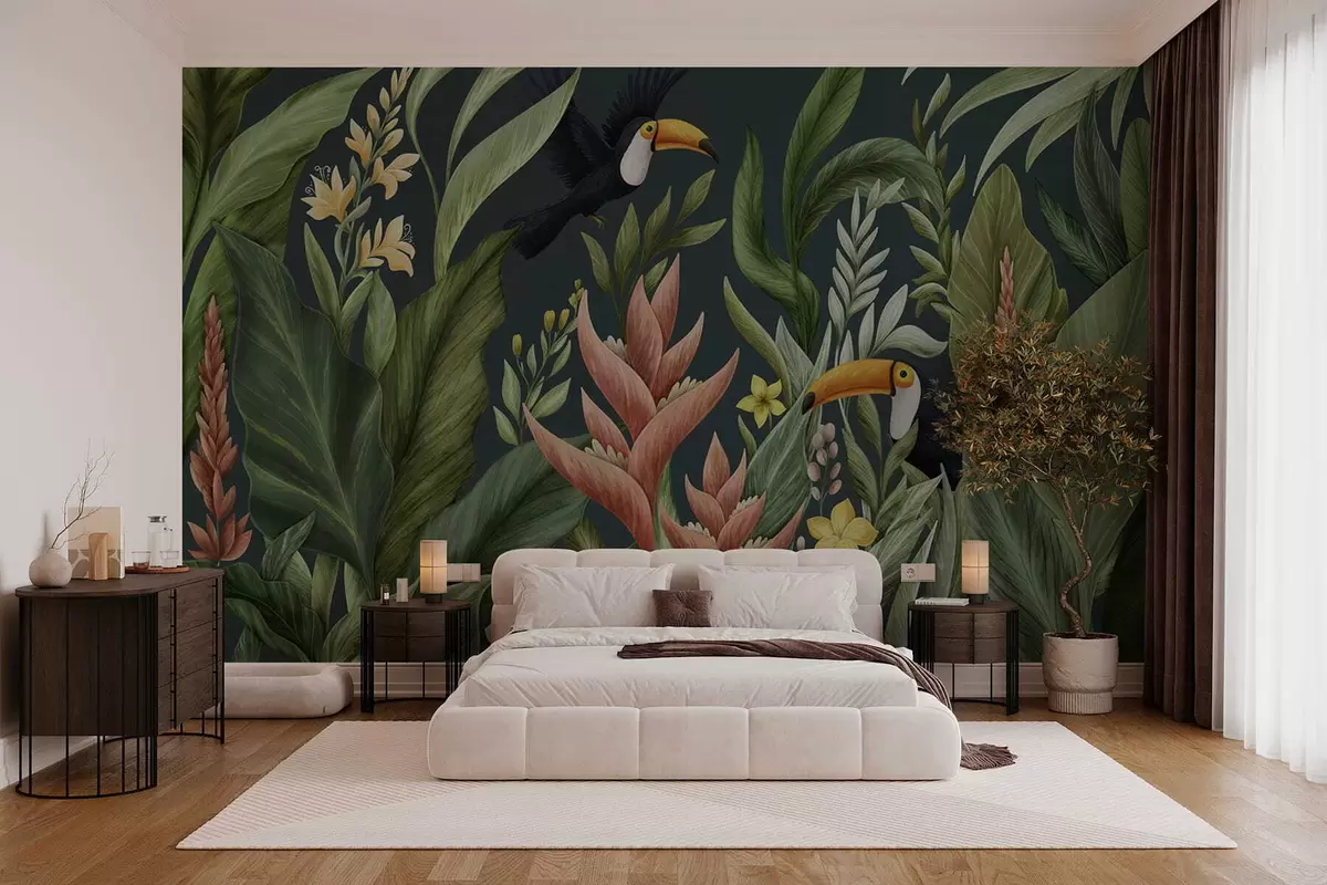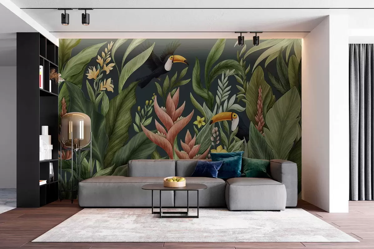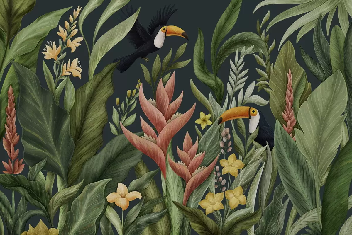 Fototapet Tropiska växter och fåglar med stora näbbar mot mörk bakgrund Nr. w05088v2