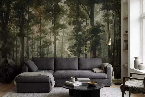 Fototapet Skogsimpression med dimma, höga träd och en stig Nr. w05089