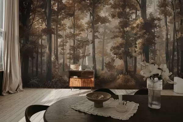 Fototapet Höstlig skogsscen med varmt ljus och täta träd Nr. w05089v1