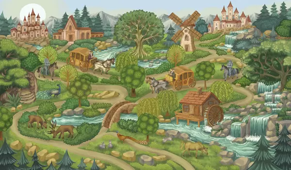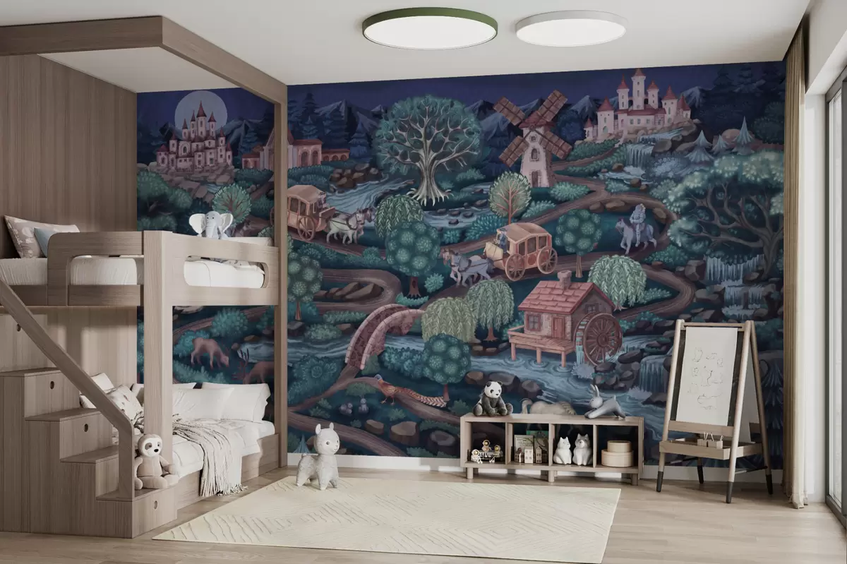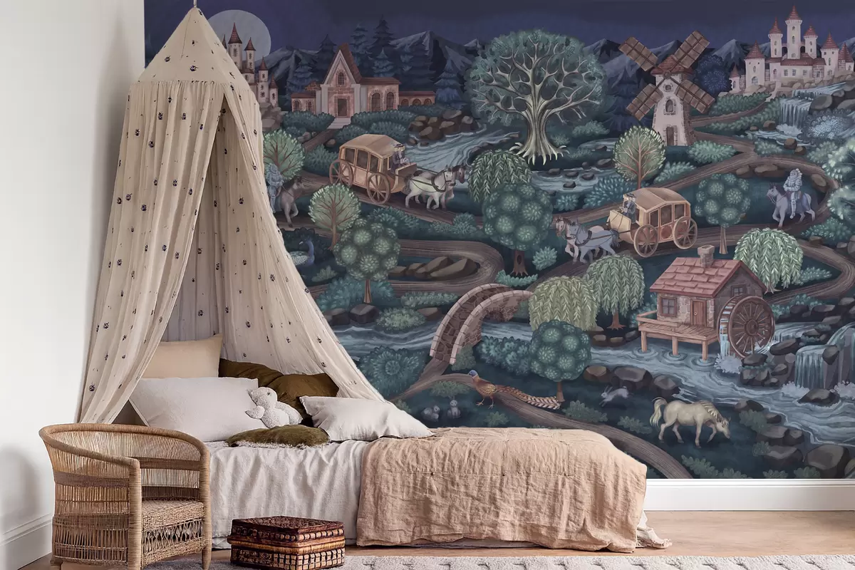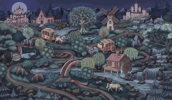 Fototapet Nattlig älvscen med slott, kvarnar och skog Nr. w05091