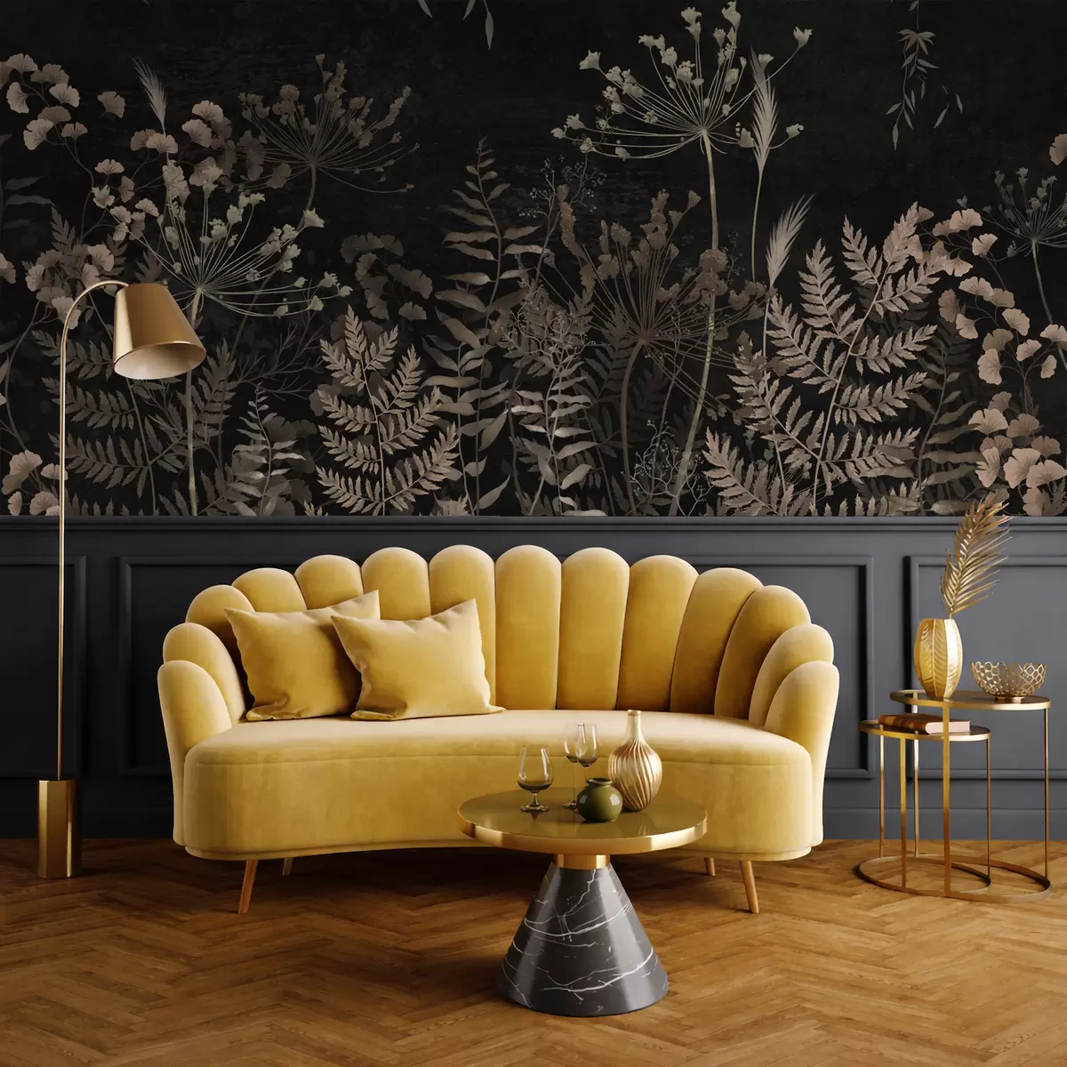 Fototapet Mörkt botaniskt mönster med blommor och blad Nr. w05092