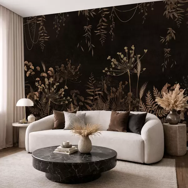 Fototapet Mörkt botaniskt mönster med blommor och gräs Nr. w05092v3