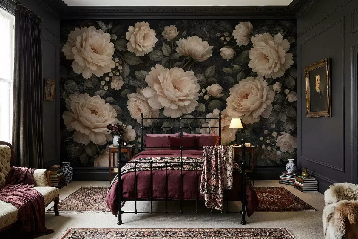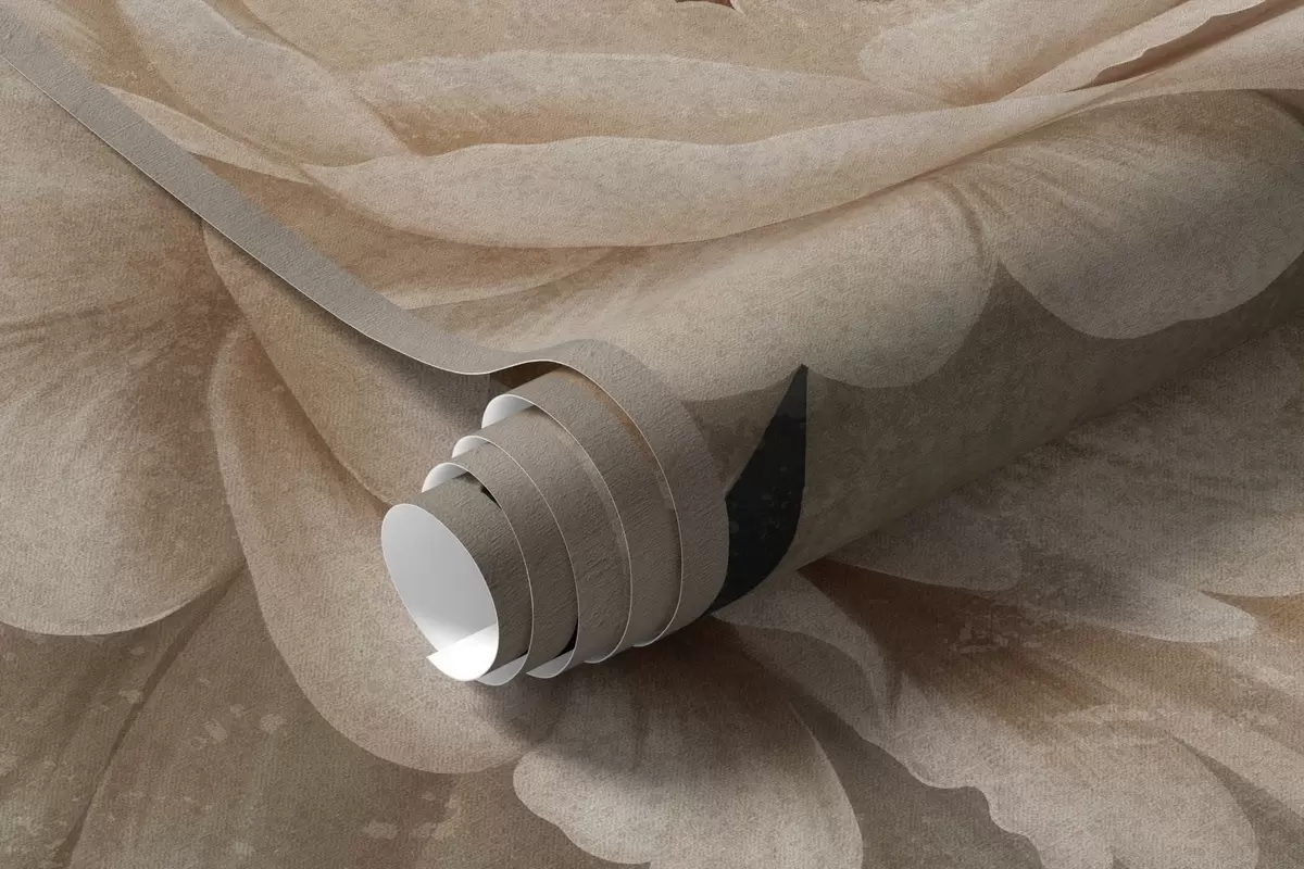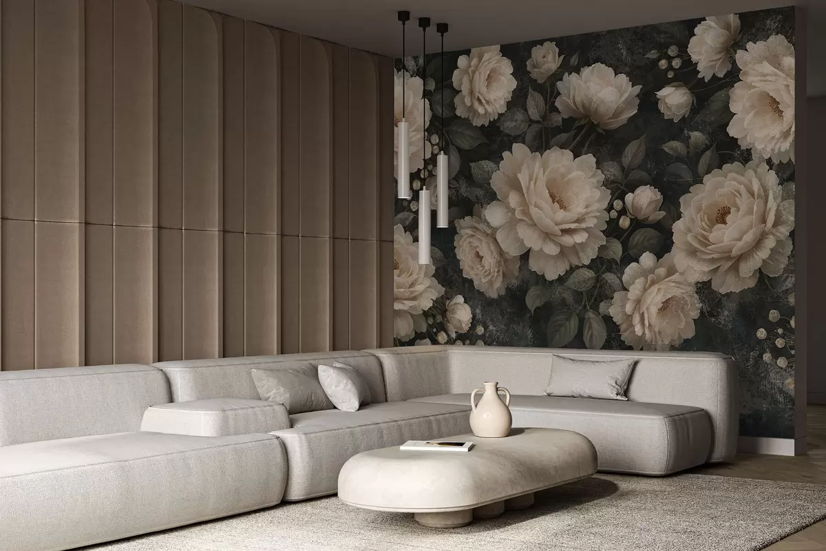 Fototapet Voluminösa blommor i beige färgskala på mörk bakgrund Nr. w05114