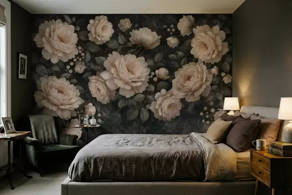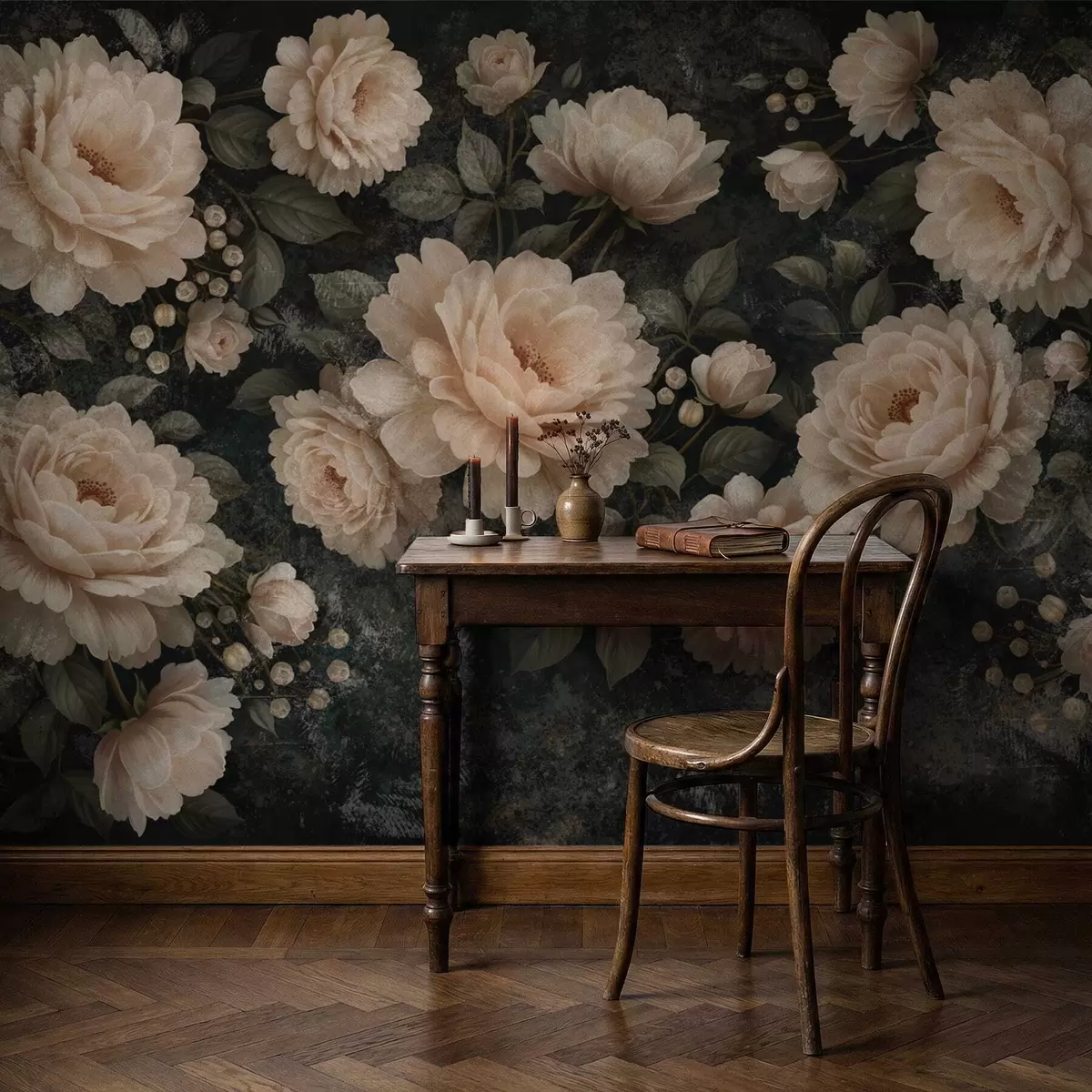 Fototapet Voluminösa blommor i beige färgskala på mörk bakgrund Nr. w05114