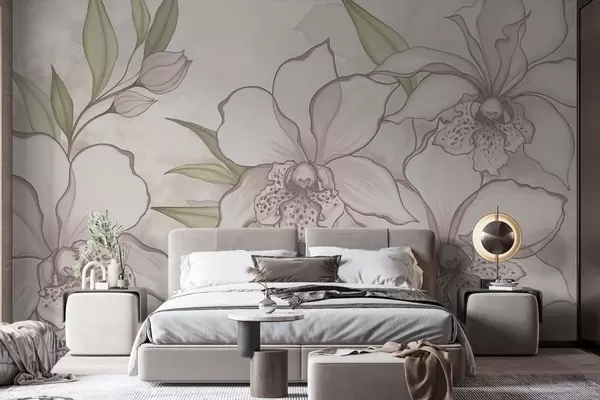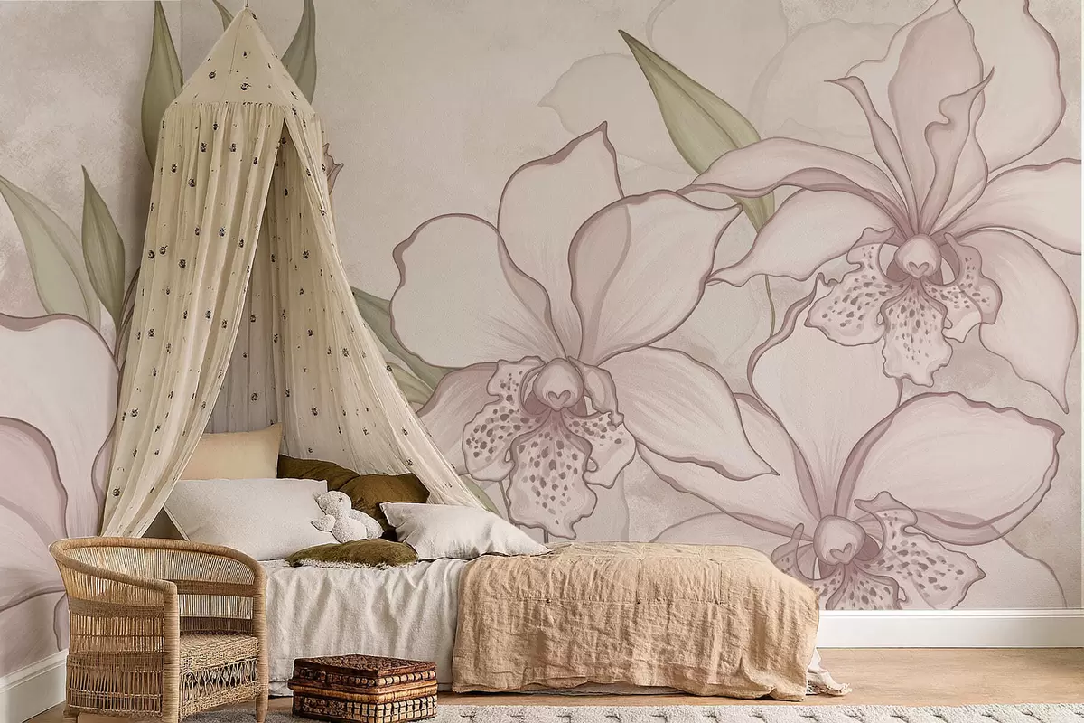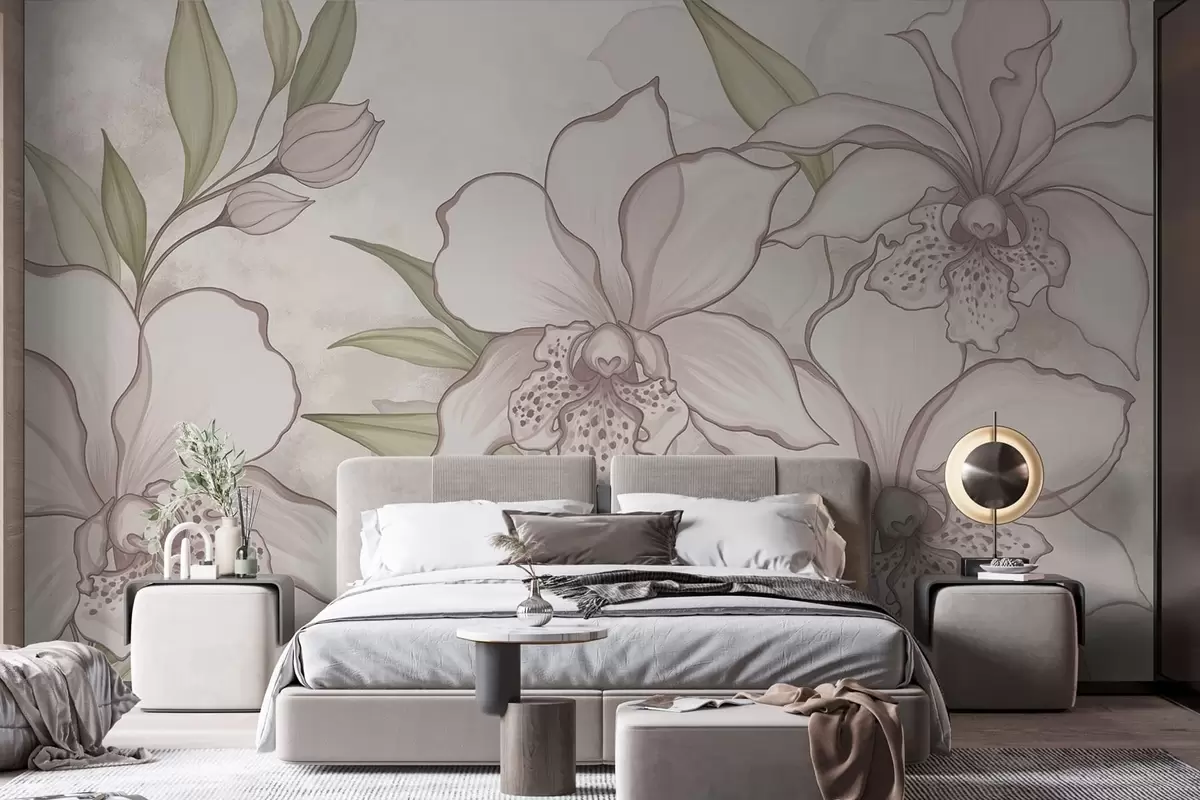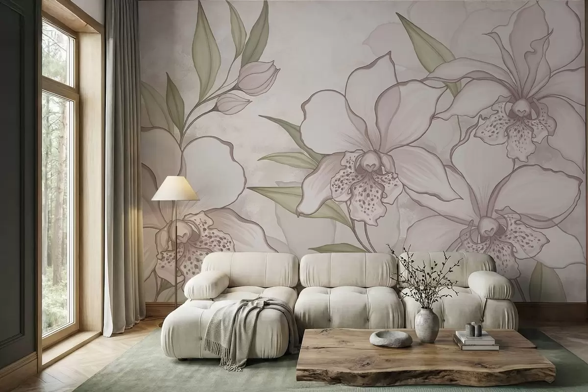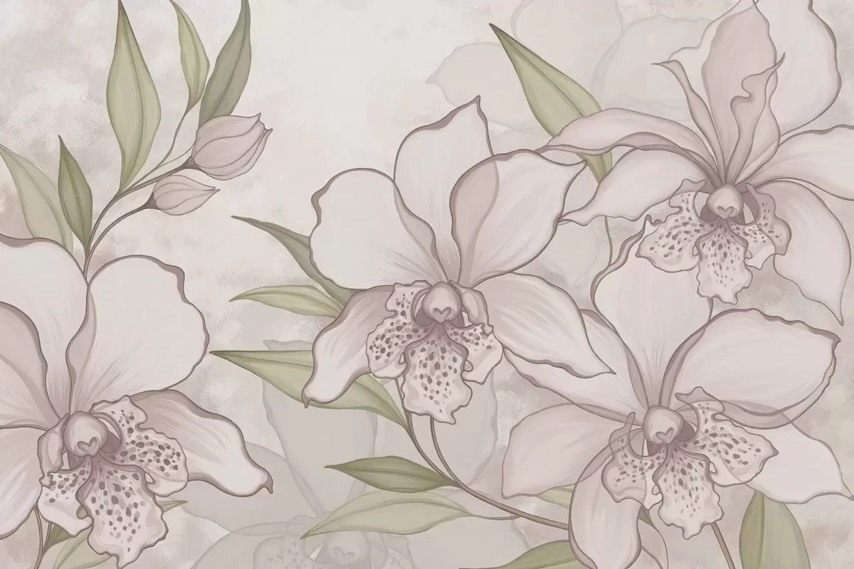 Fototapet Illustration av bleka orkidéer med blad på beige bakgrund Nr. w05117