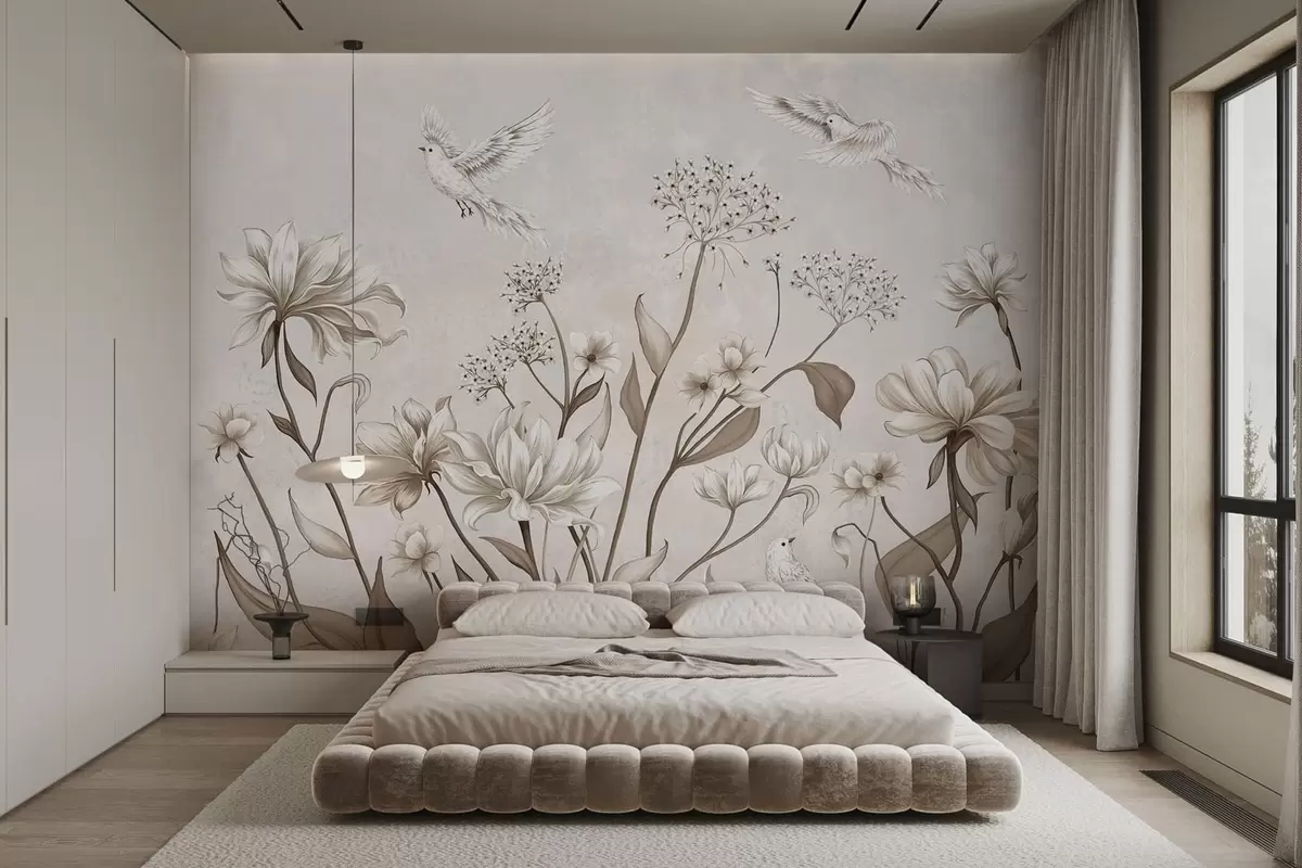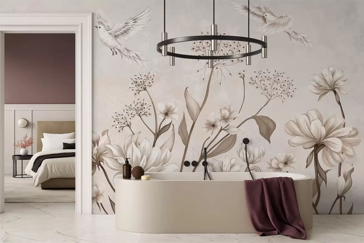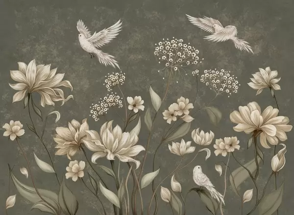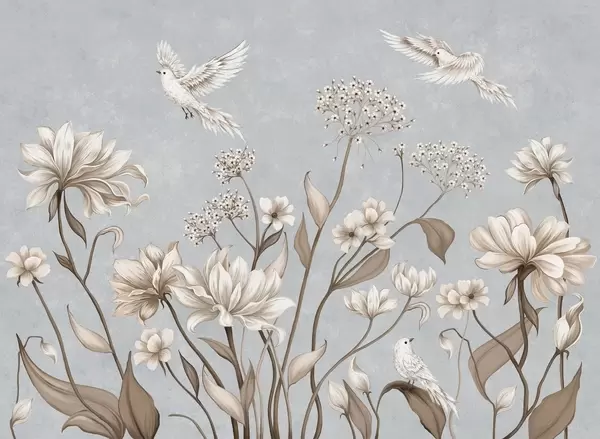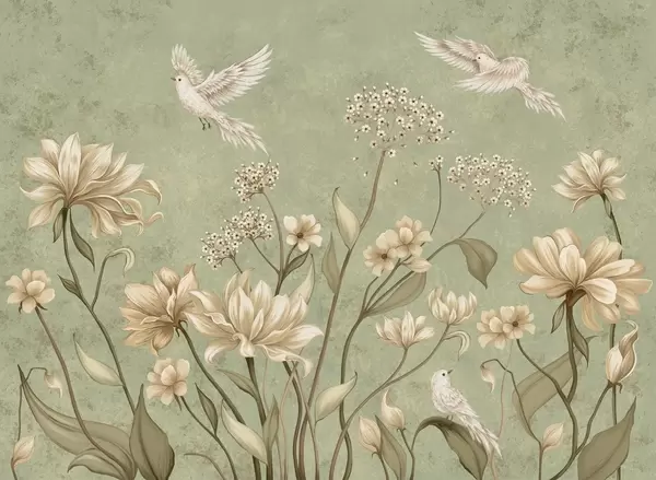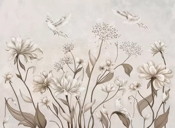 Fototapet Ljusa blommor och fåglar mot en mjuk bakgrund Nr. w05118