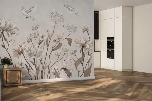 Fototapet Ljusa blommor och fåglar mot en mjuk bakgrund Nr. w05118