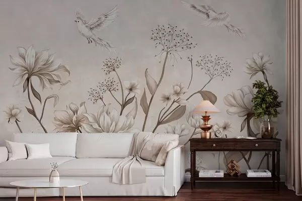 Fototapet Ljusa blommor och fåglar mot en mjuk bakgrund Nr. w05118