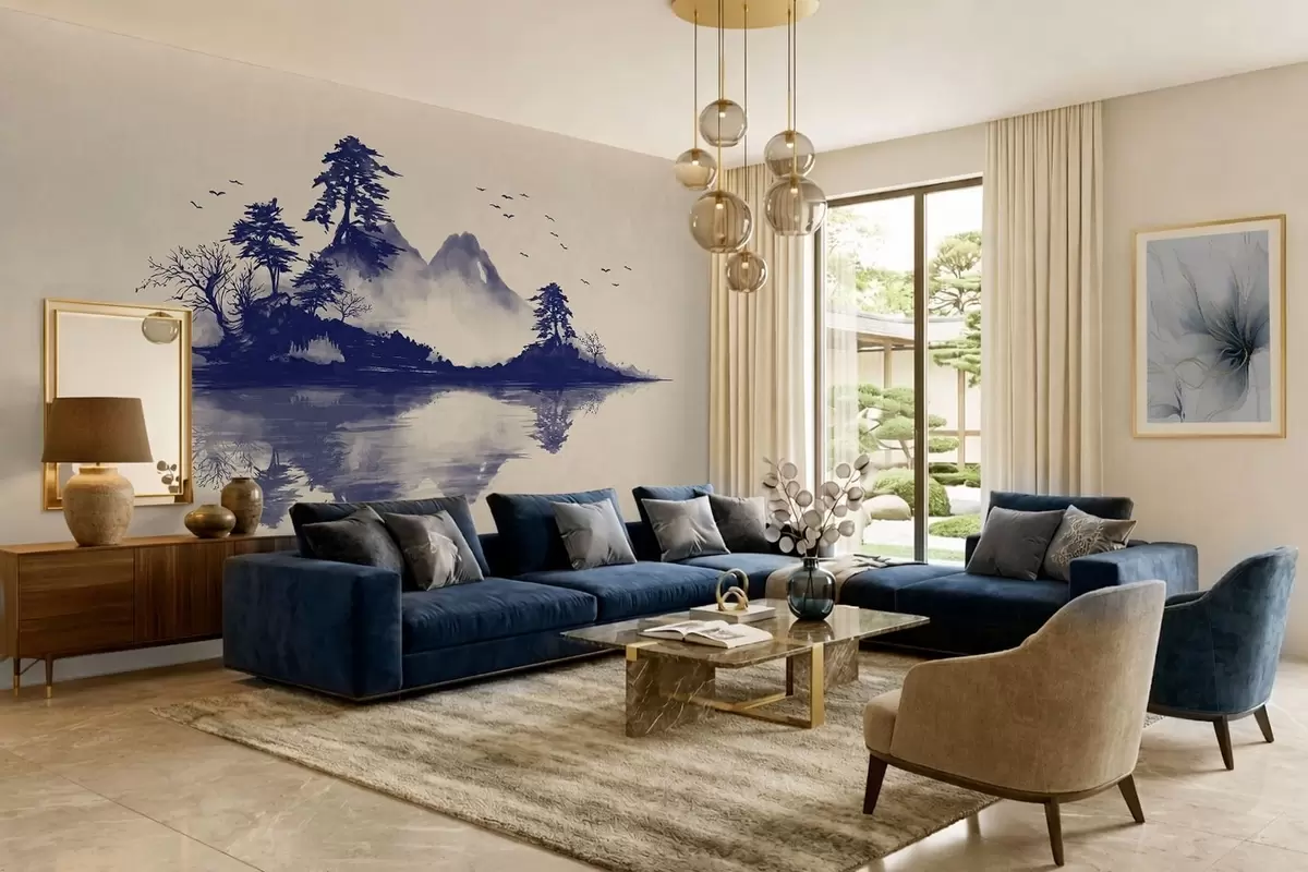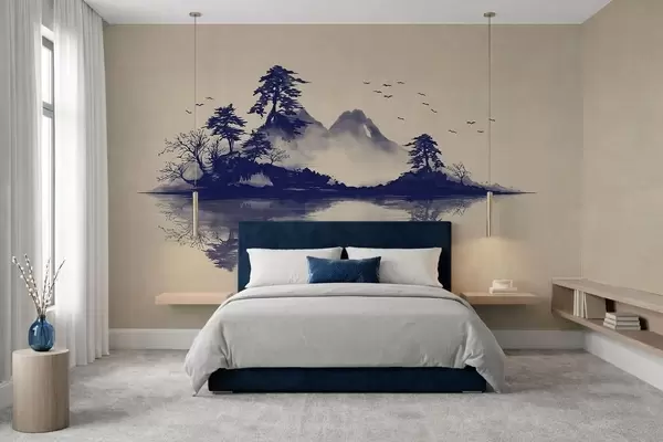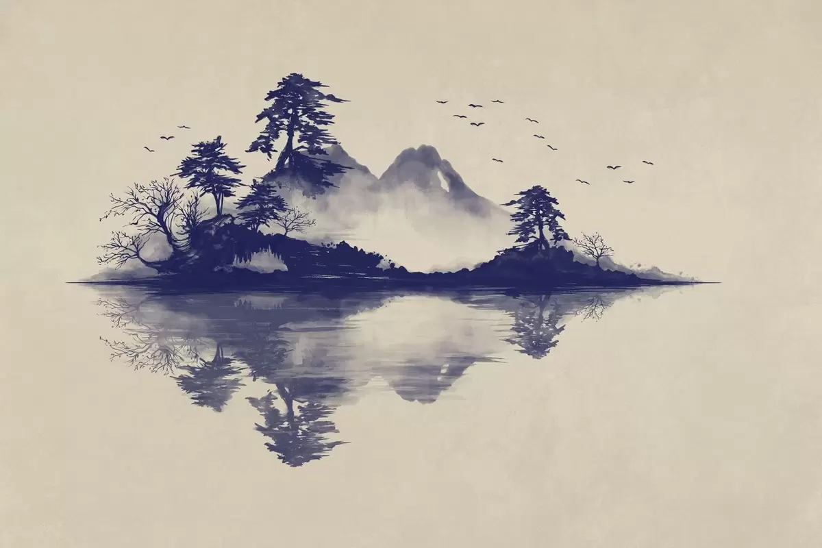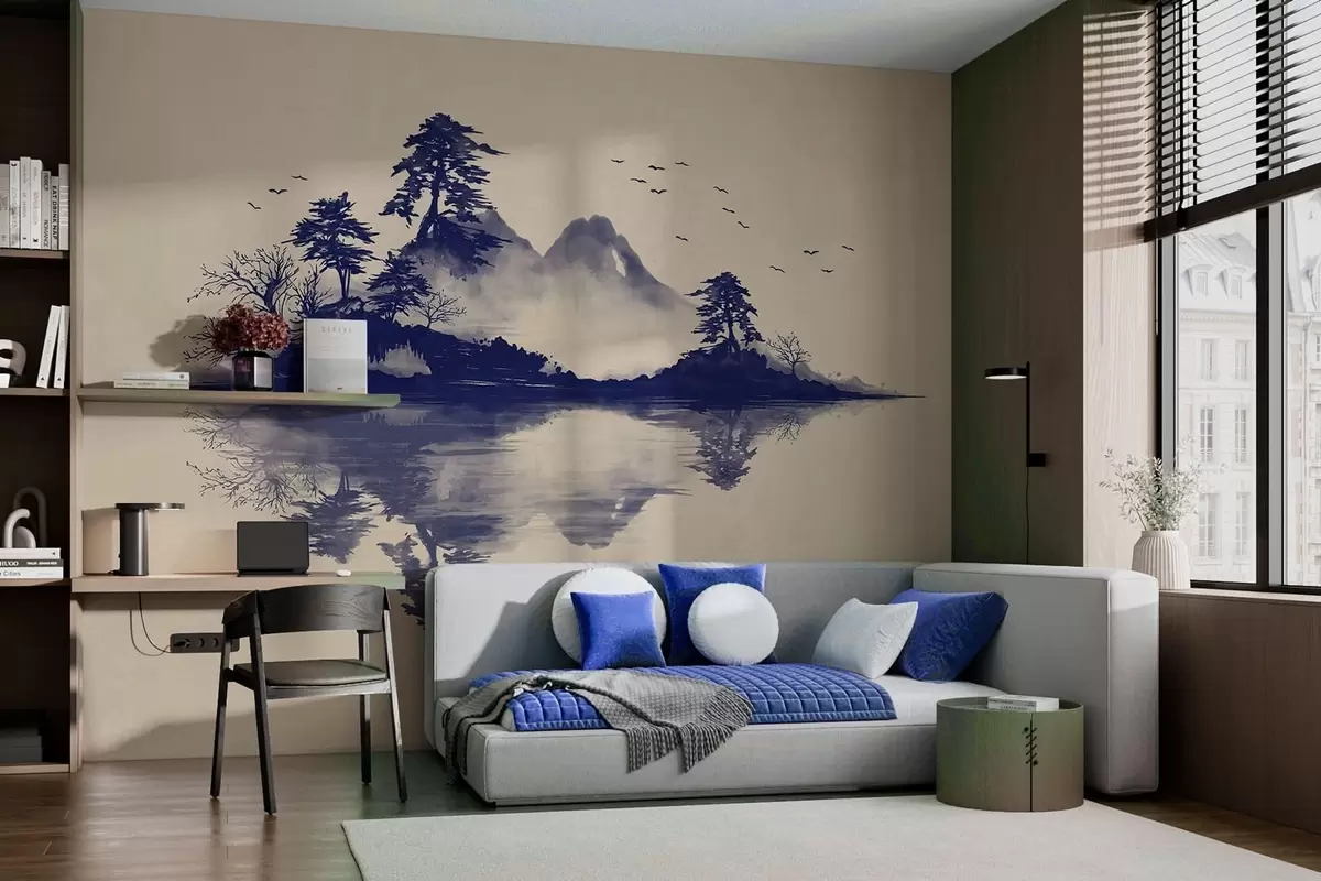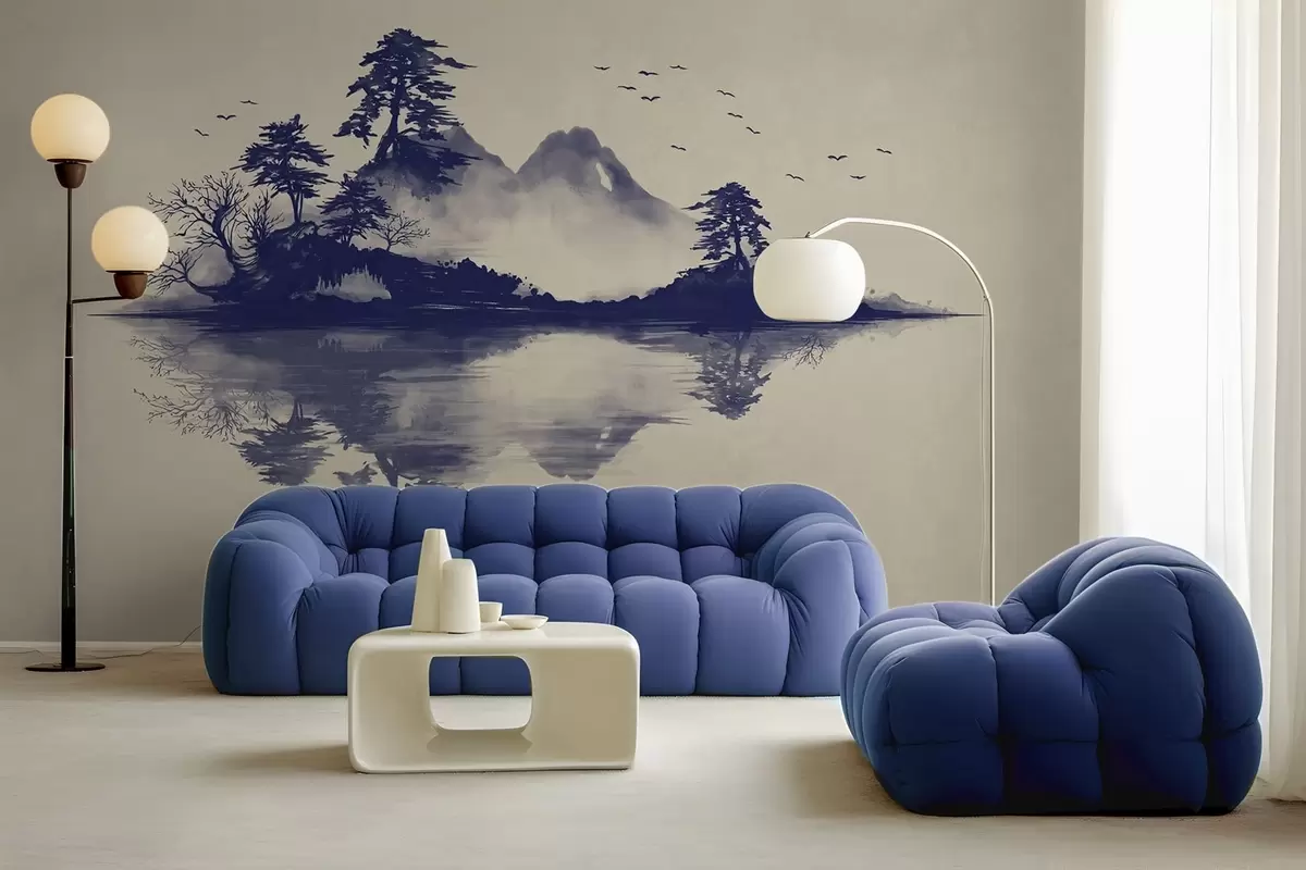 Fototapet Sumi-e-bergslandskap i blå nyanser Nr. w05124v2