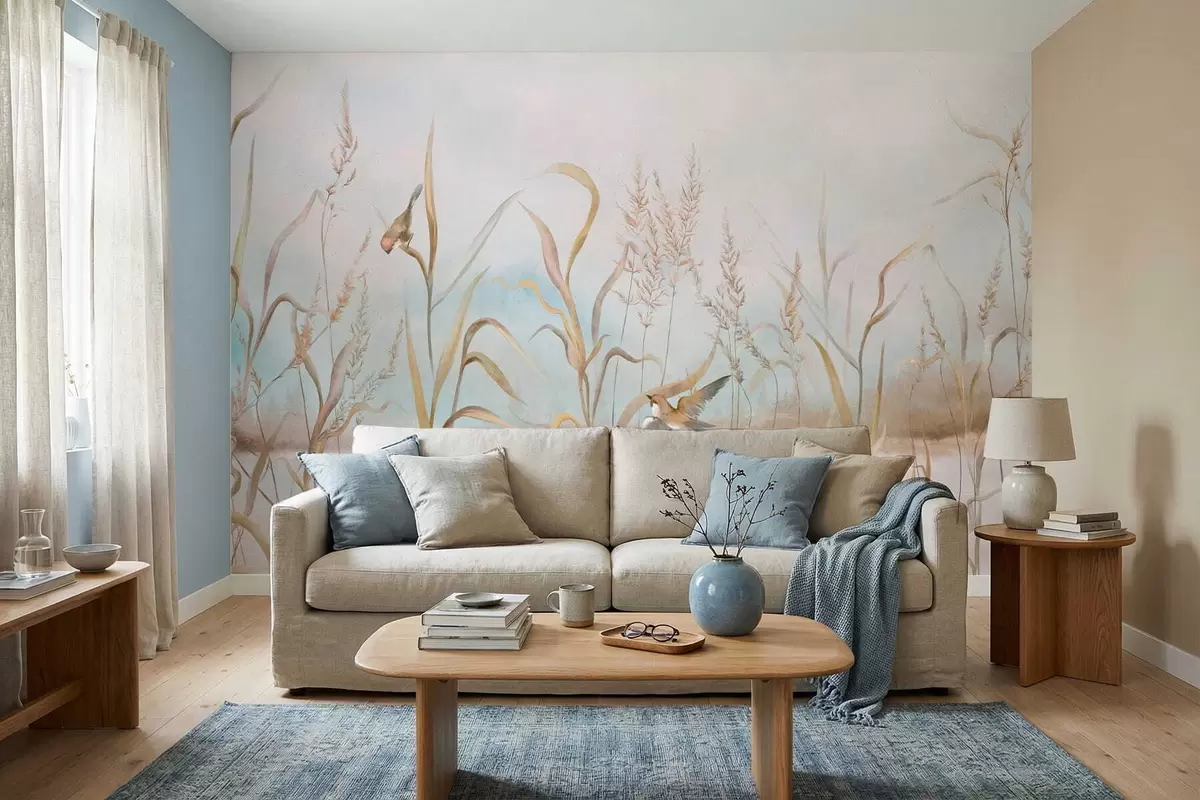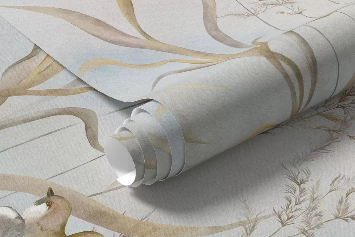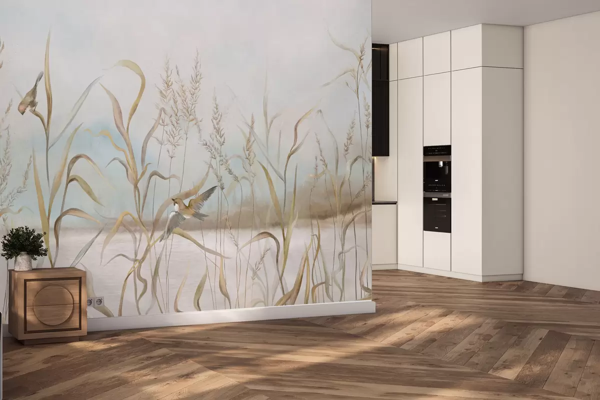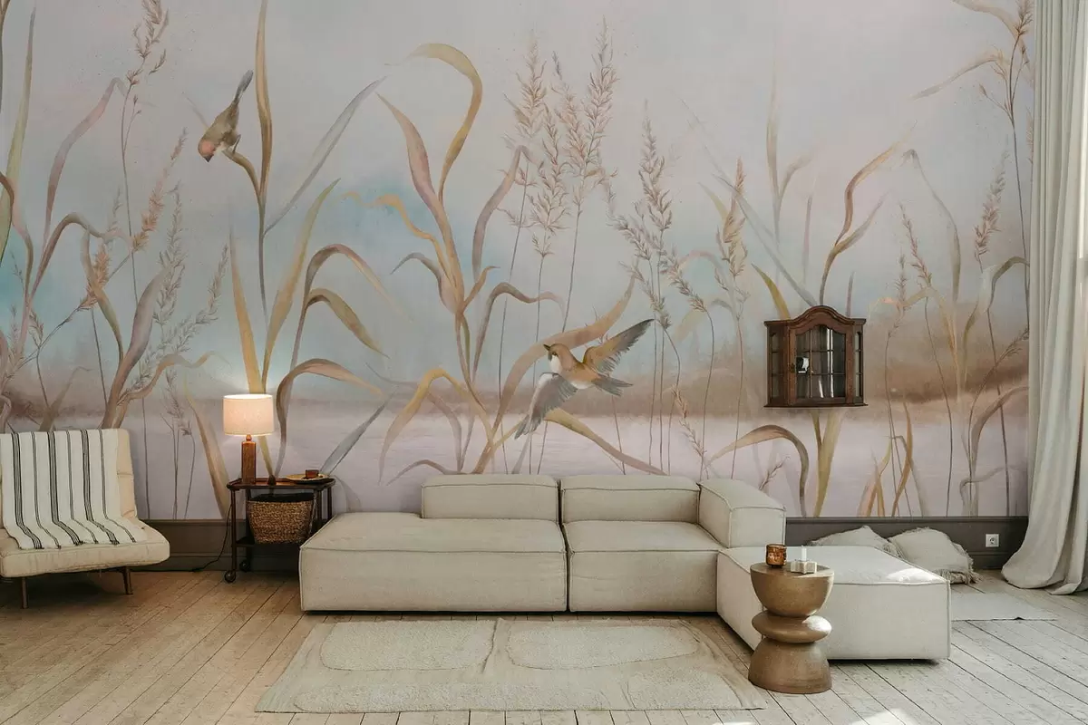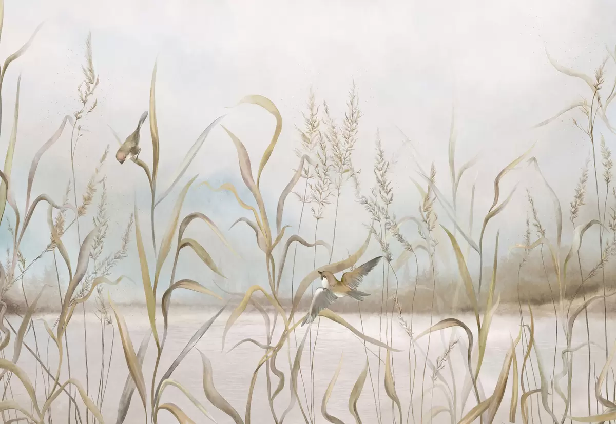 Fototapet Illustration av vass och fåglar vid vattnet i mjuka toner Nr. w05125