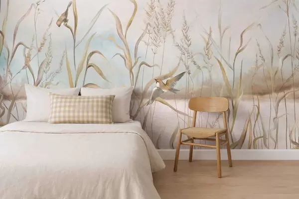 Fototapet Illustration av vass och fåglar vid vattnet i mjuka toner Nr. w05125