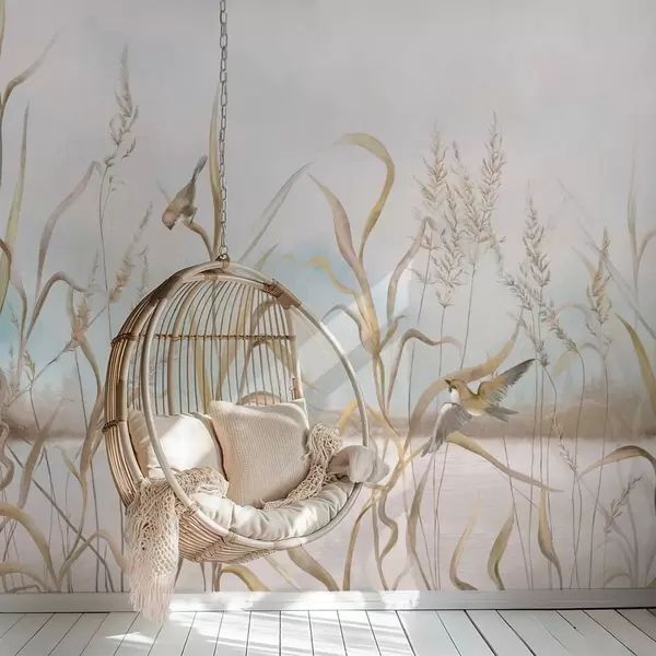 Fototapet Illustration av vass och fåglar vid vattnet i mjuka toner Nr. w05125