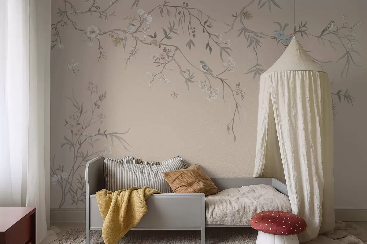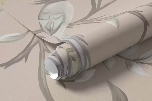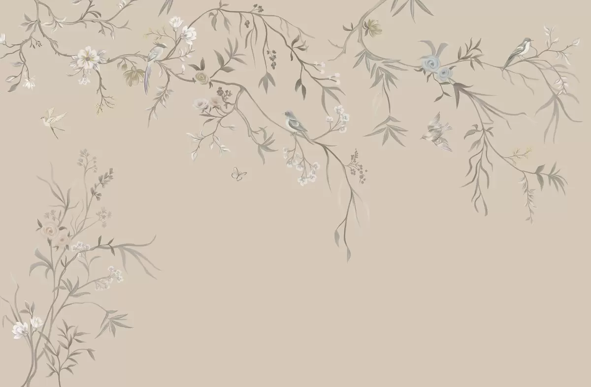Fototapet Blommiga grenar med fåglar på varm beige bakgrund Nr. w05127v1