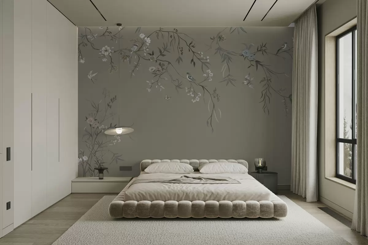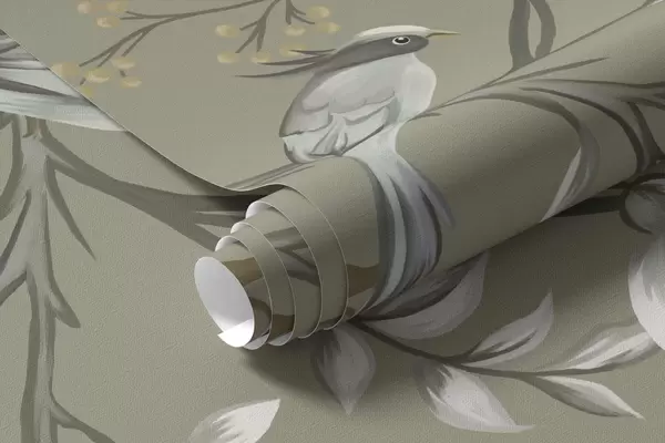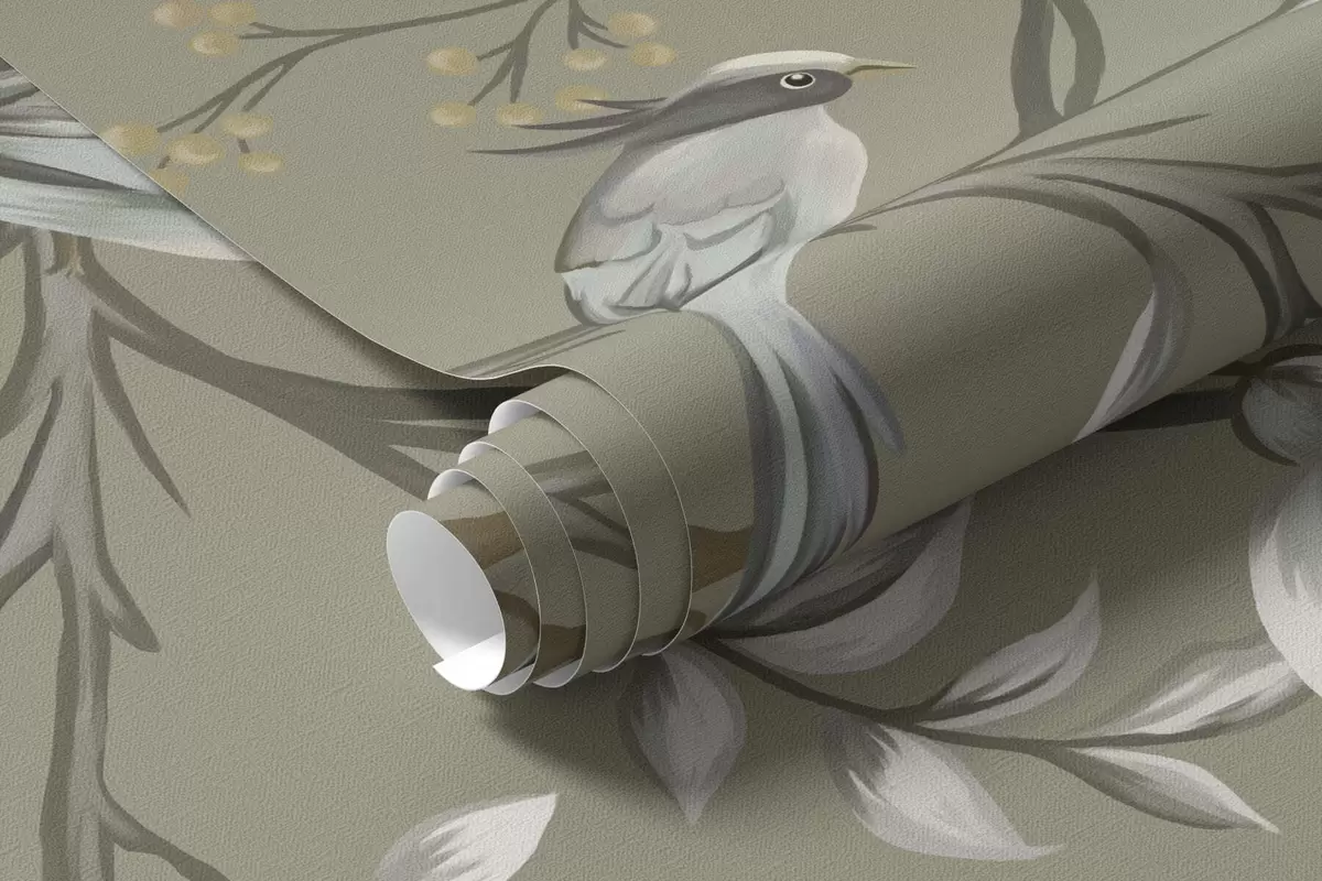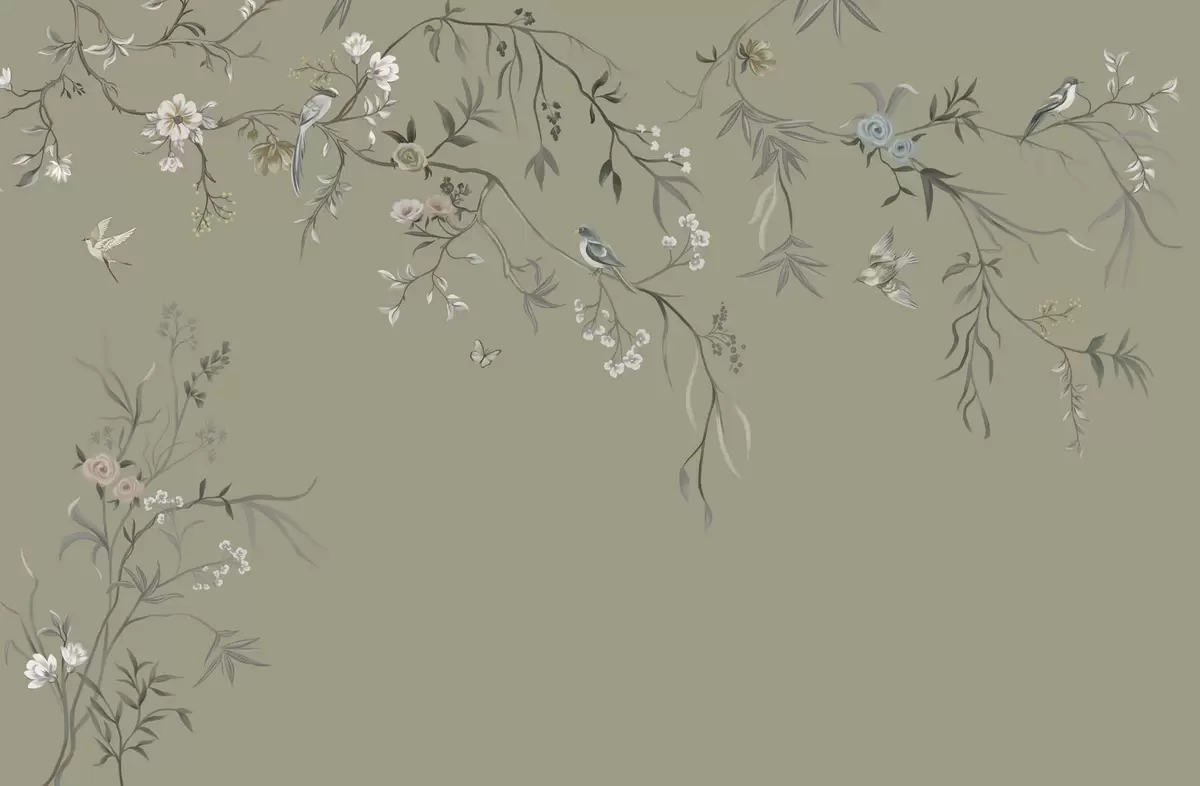 Fototapet Blommotiv med fåglar på grå bakgrund Nr. w05127v4