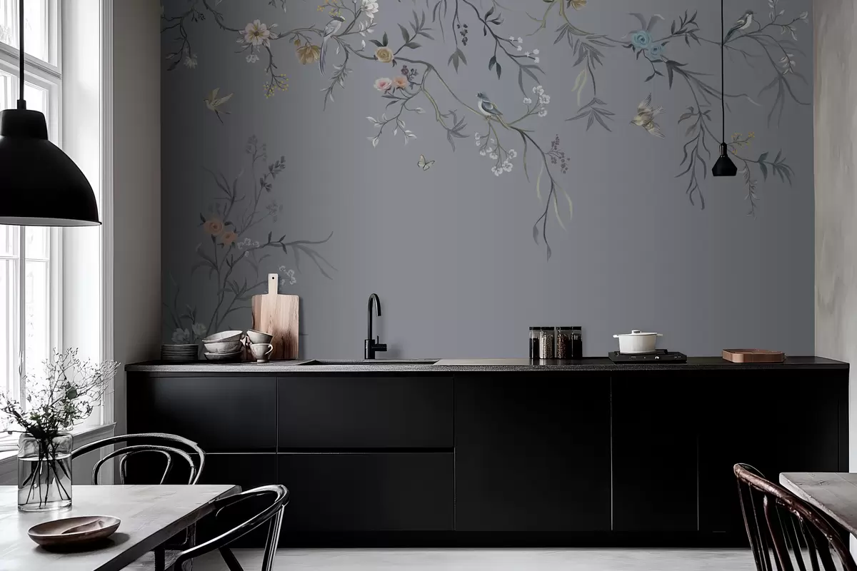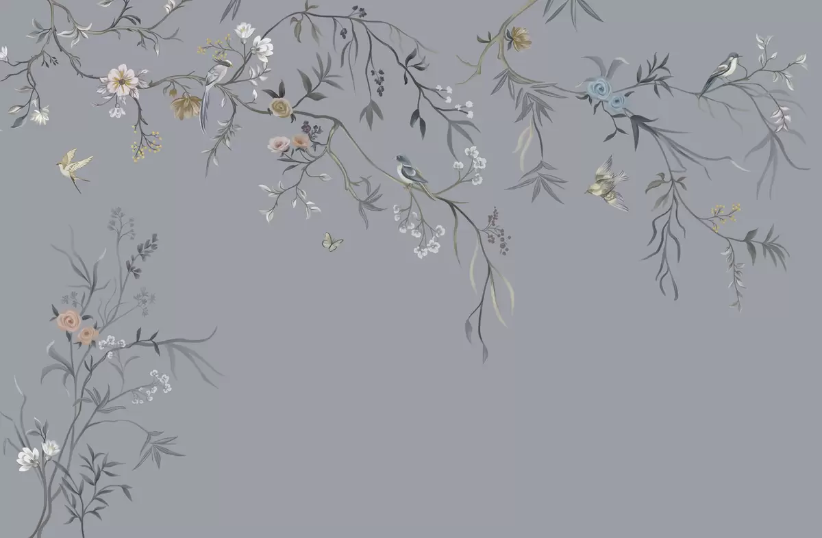 Fototapet Blommiga grenar med fåglar på grönaktig bakgrund Nr. w05127v5