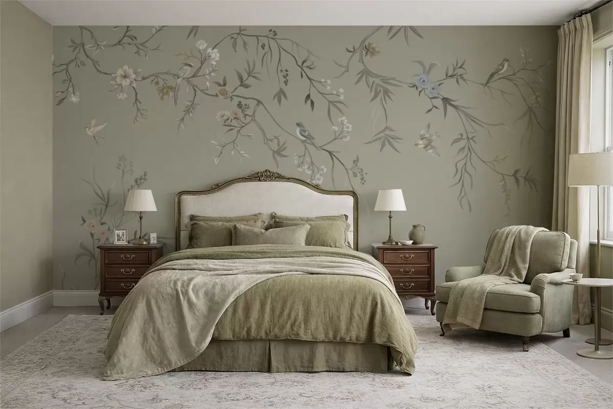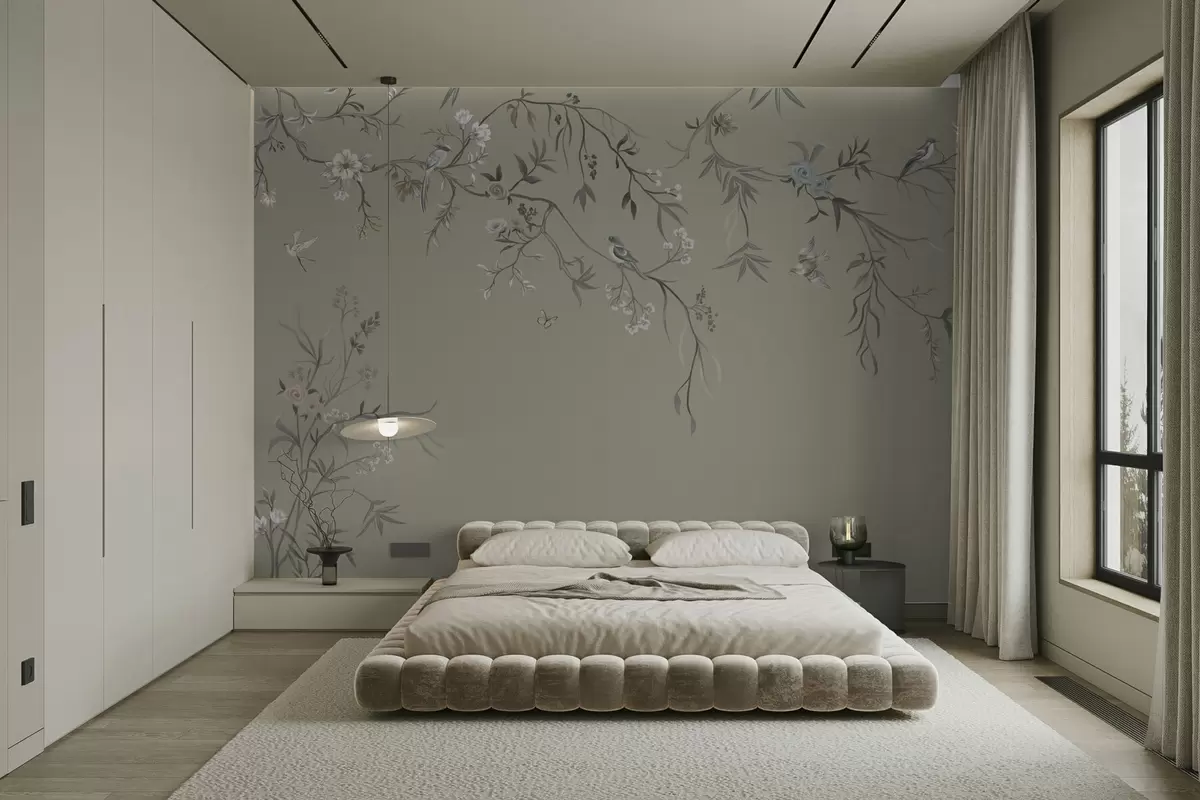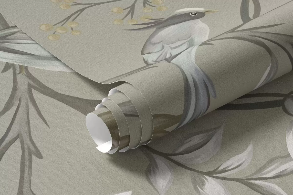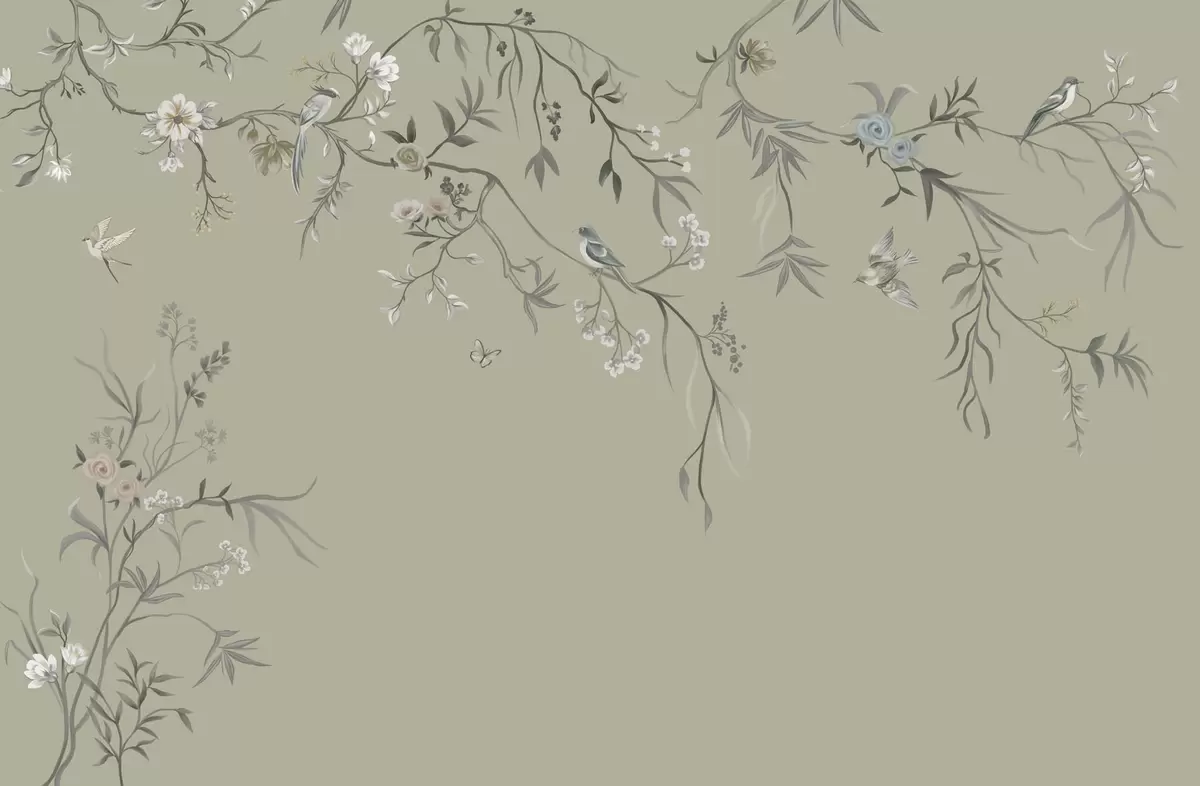 Fototapet Blommönster med fåglar på sval bakgrund Nr. w05127v6