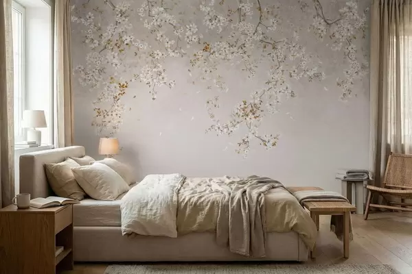 Fototapet Grenar med vita blommor på en mjuk beige bakgrund Nr. w05129