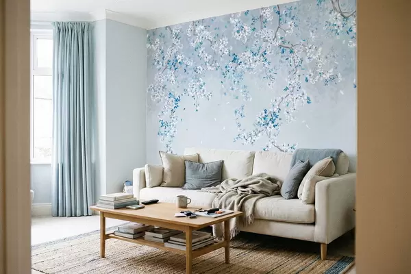Fototapet Grenar med vita och blå blommor på en sval bakgrund Nr. w05129v2