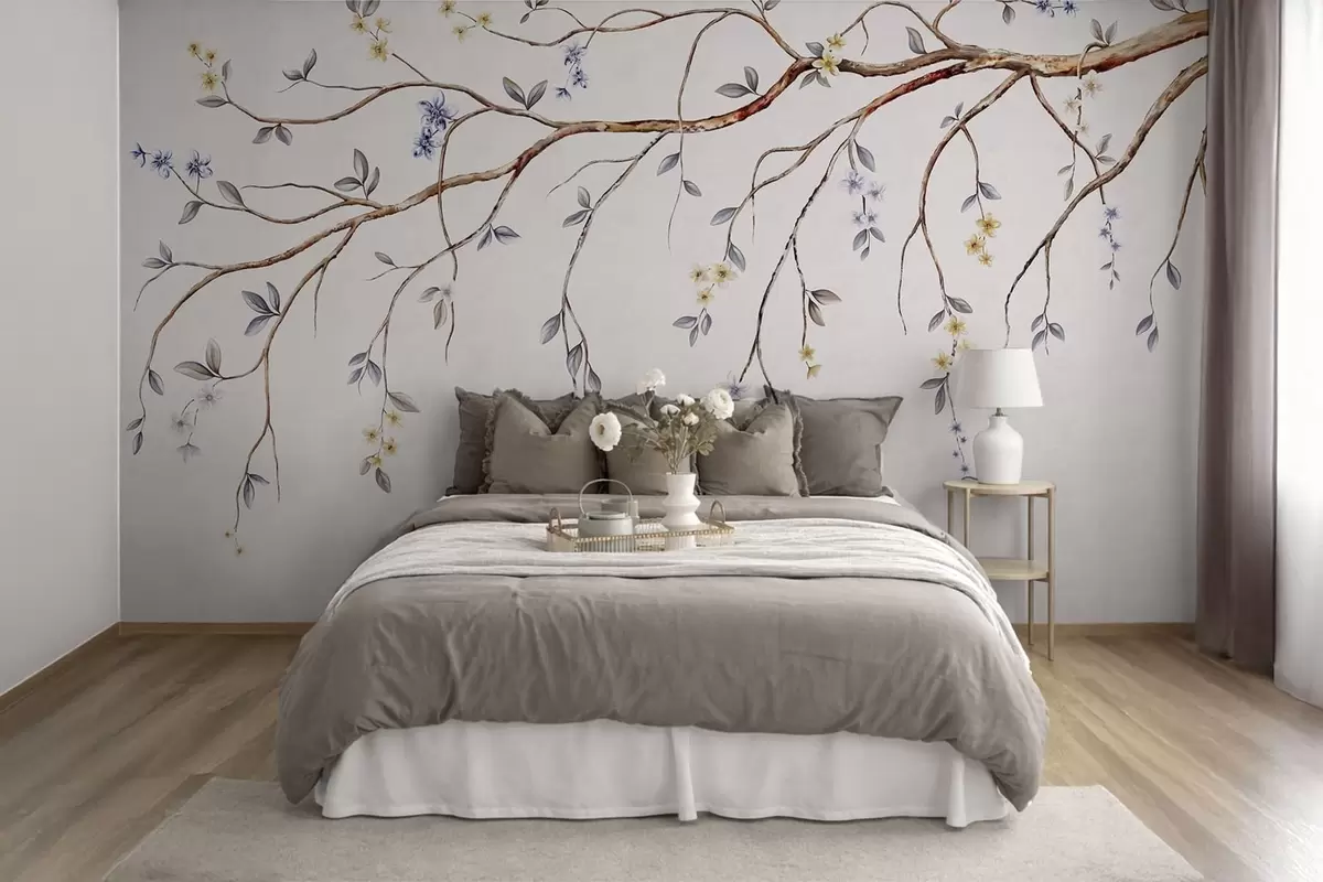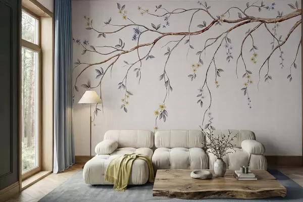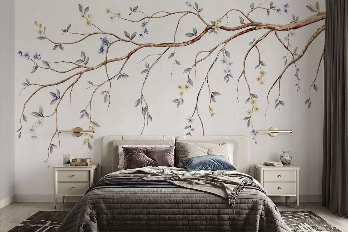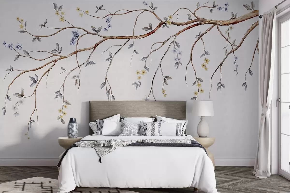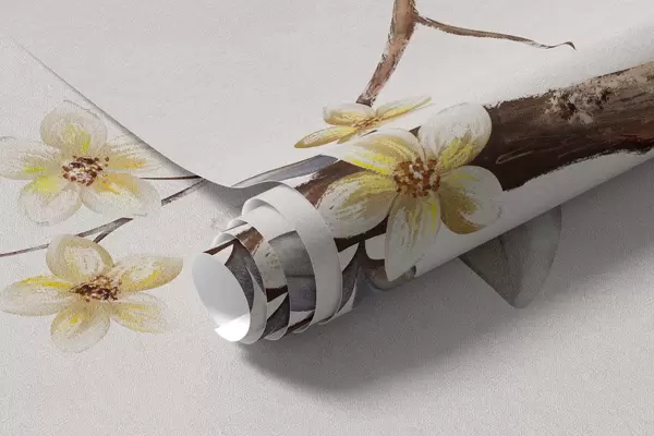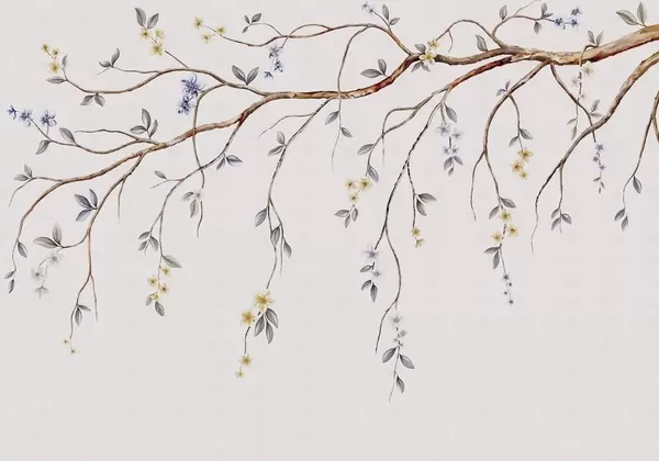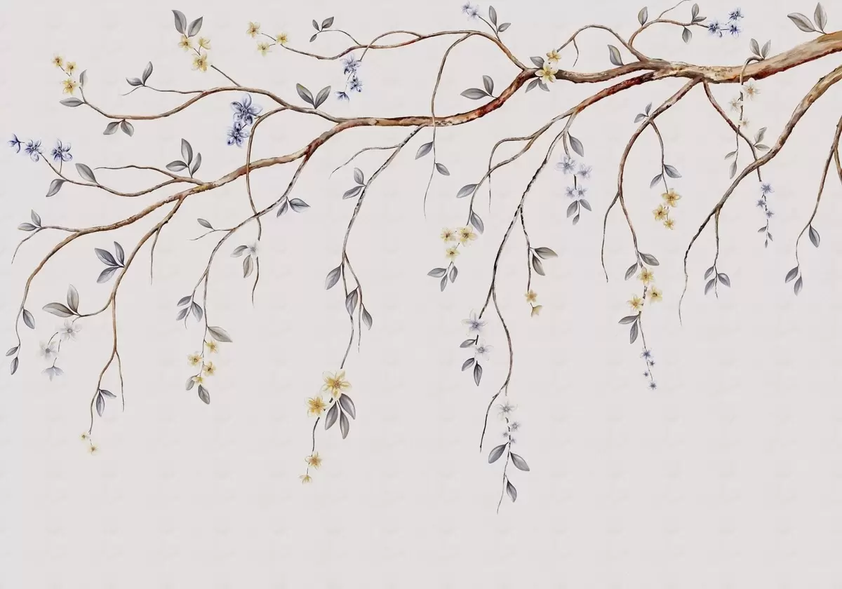 Fototapet Tunna grenar med små blommor på ljus bakgrund Nr. w05145