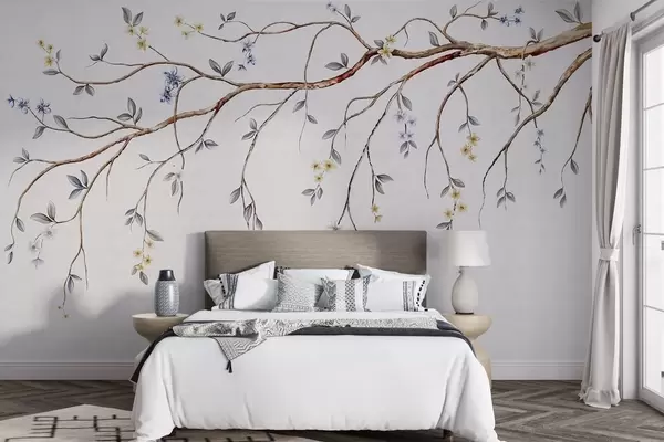 Fototapet Tunna grenar med små blommor på ljus bakgrund Nr. w05145