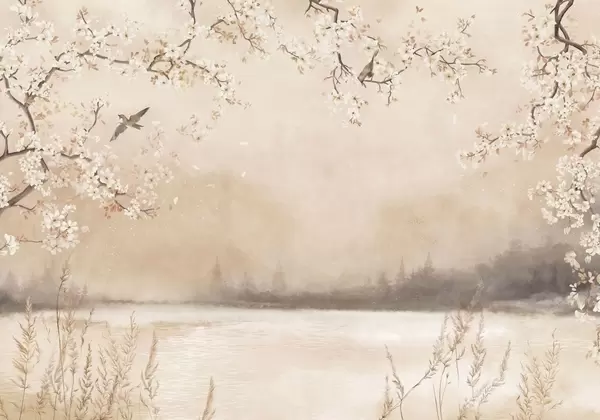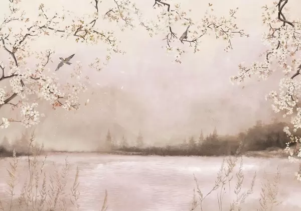 Fototapet Delikata blommande grenar vid sjön med fåglar i lätt dimma Nr. w05155